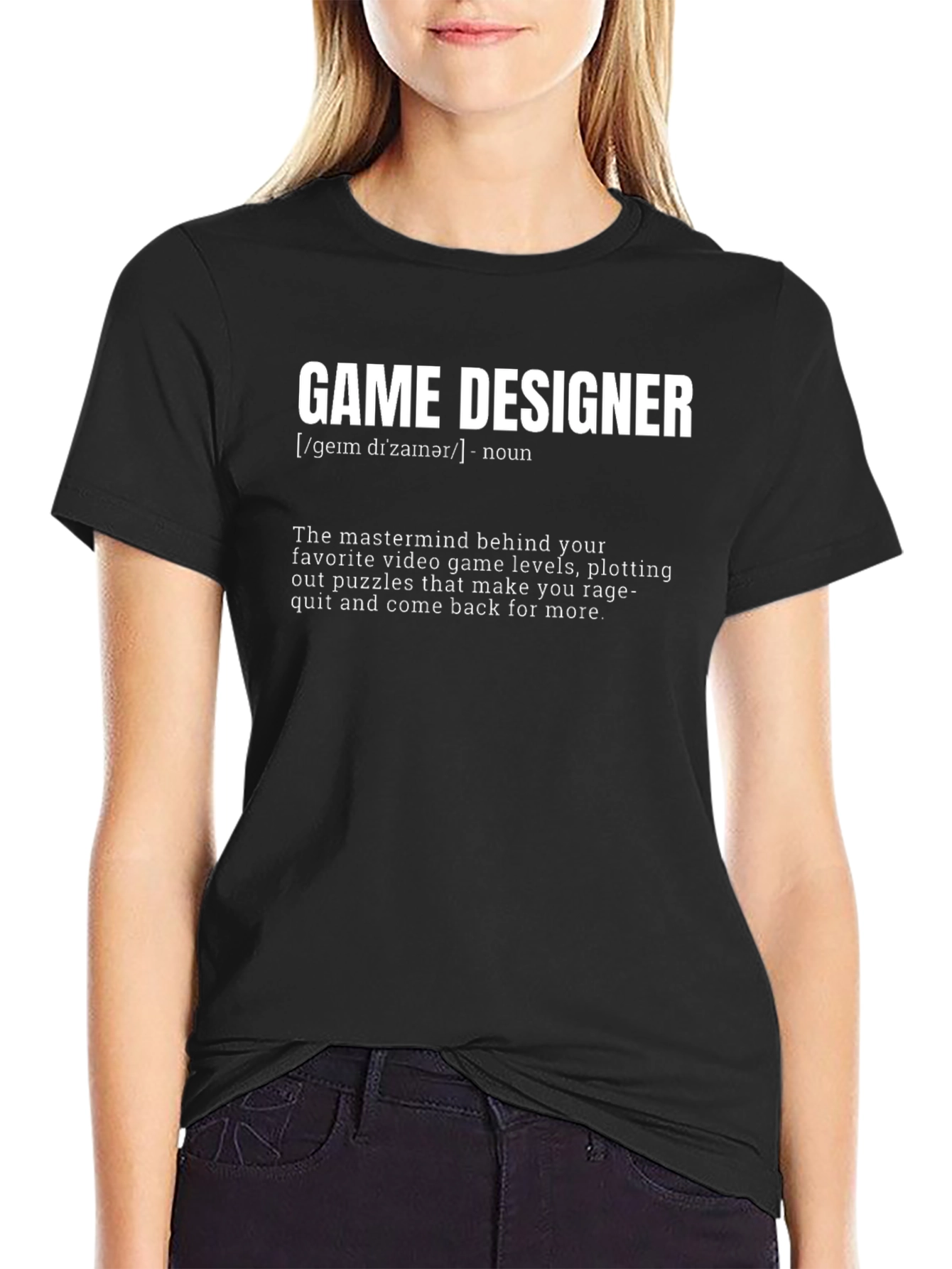 This black t-shirt features a bold, white graphic that declares the wearer as a "GAME DESIGNER." Below the title, a phonetic spelling is displayed along with the word "noun." The shirt further defines a game designer as "The mastermind behind your favorite video game levels, plotting out puzzles that make you rage-quit and come back for more." Crafted from a comfortable, likely breathable fabric, this tee is perfect for casual wear, gaming conventions, or as a statement piece for anyone proud of their profession. Show off your love for game design with this unique and humorous t-shirt that's sure to spark conversations and resonate with fellow gamers.