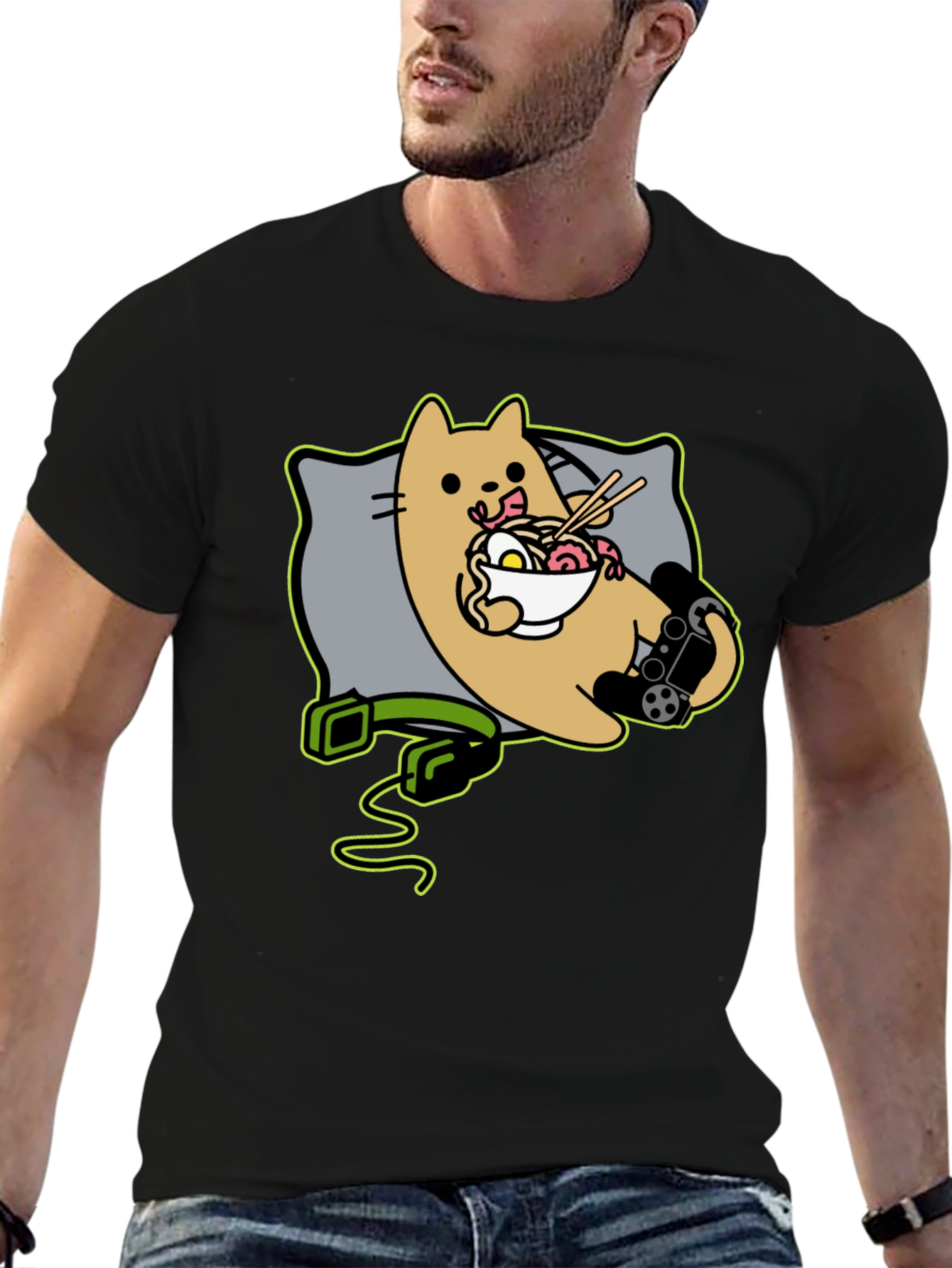 Indulge in comfort and style with this unique gamer cat t-shirt. Featuring a playful design, it showcases a cartoon cat character relishing a bowl of ramen while gaming. The relaxed cat is set on a pillow with a headset, promising a comfortable, fun vibe. This tee is perfect for casual wear, gaming sessions, or adding a whimsical touch to your everyday outfit. Makes an ideal gift for cat lovers, gamers, and ramen enthusiasts alike. Get ready to turn heads and spark conversations with this eye-catching tee.