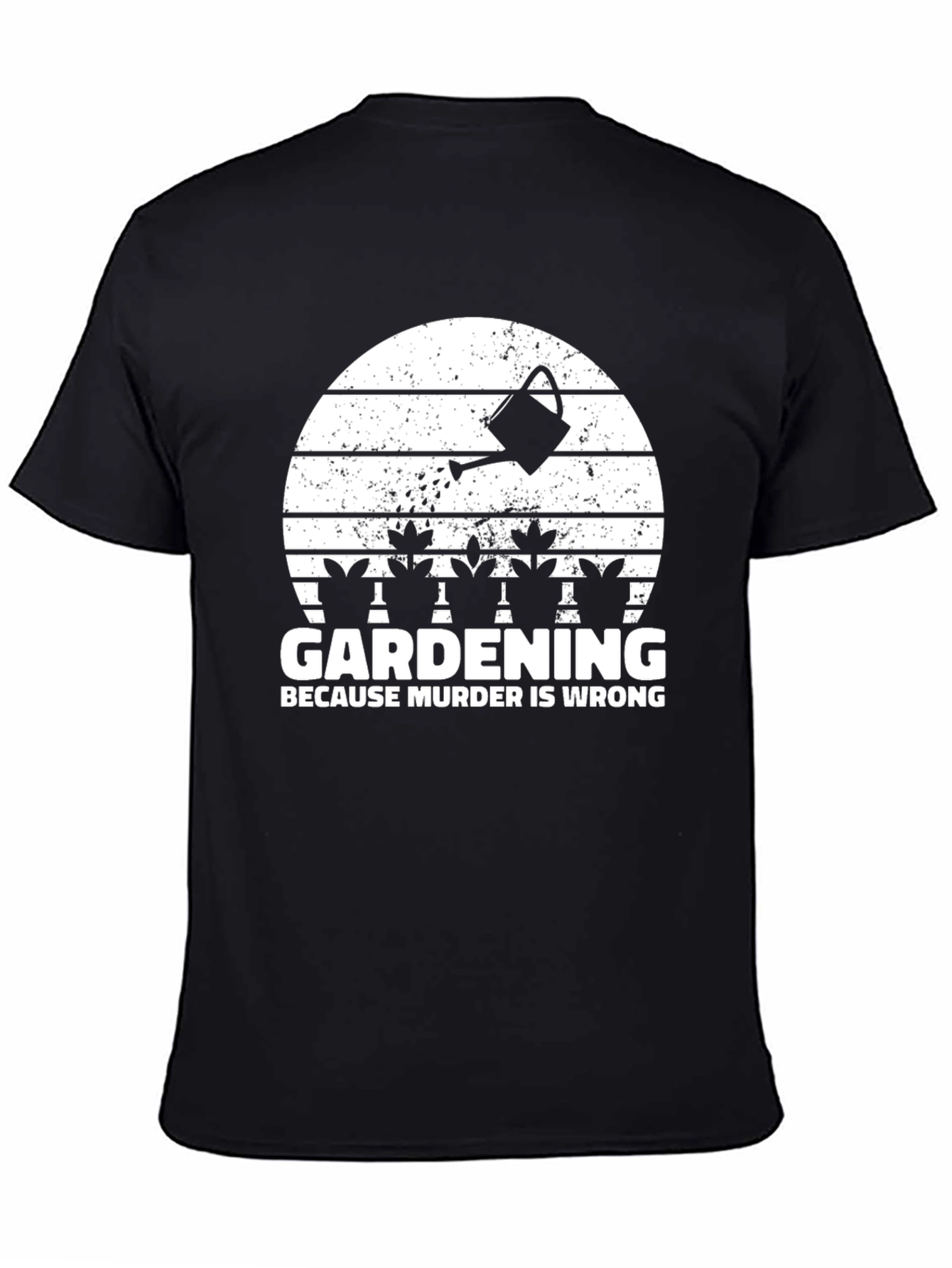 Show off your love for gardening and your sense of humor with this black graphic t-shirt. The design features a vintage-style white graphic of a watering can tending to plants, set against a retro sun background. Bold text reads "GARDENING" above the phrase "BECAUSE MURDER IS WRONG." This funny, eye-catching tee is perfect for casual wear, gardening enthusiasts, and anyone with a playful personality. Made from a comfortable and durable fabric blend, it's ideal for everyday wear or as a unique gift. Express your unique style and spread some laughter with this quirky t-shirt.