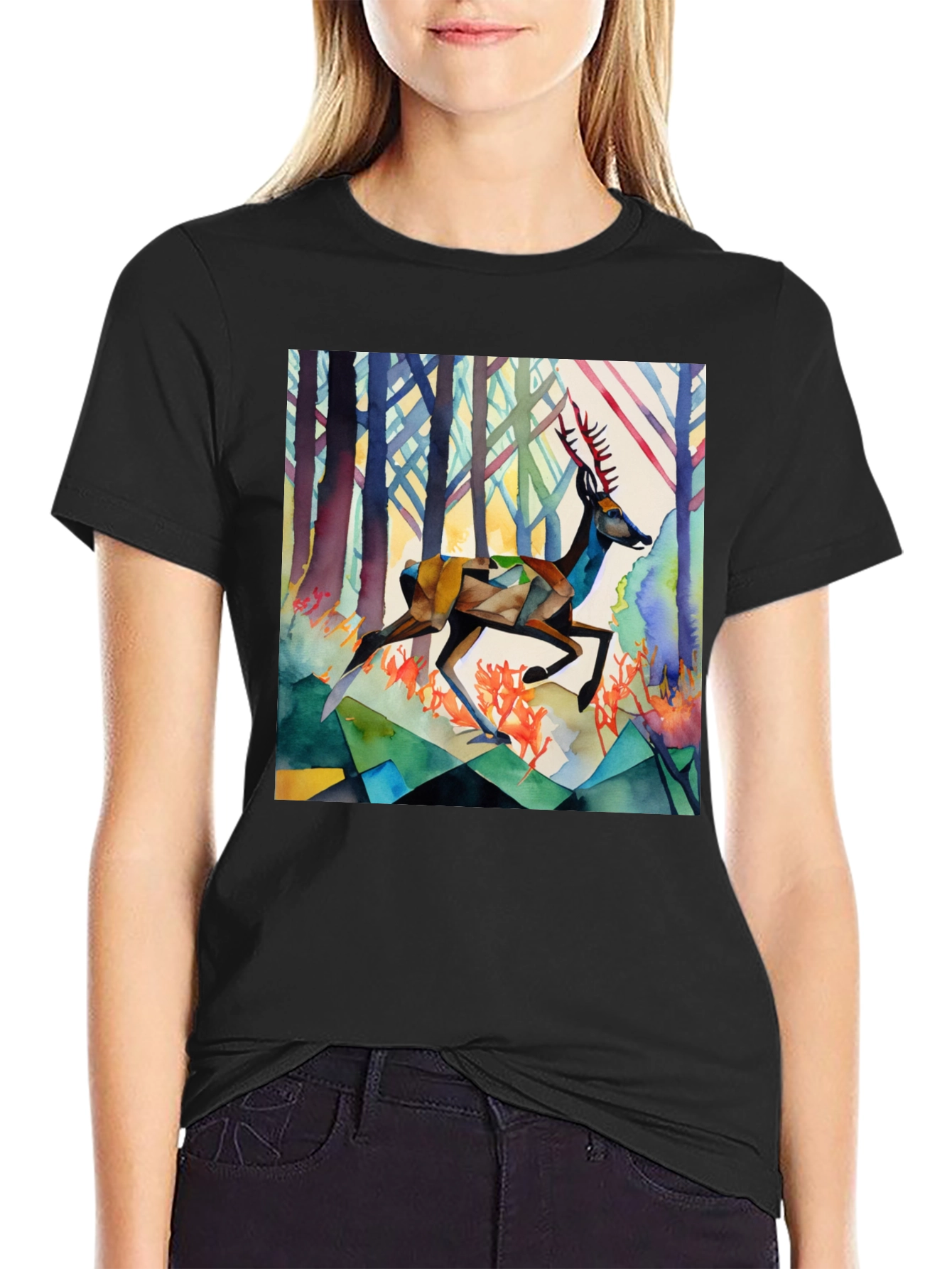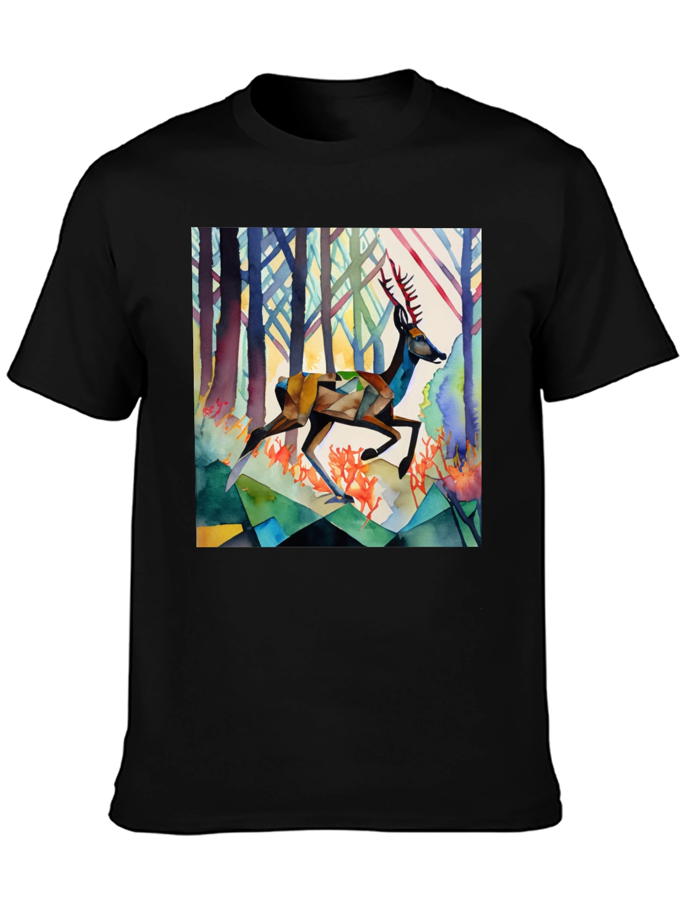 Elevate your wardrobe with this eye-catching men's t-shirt featuring a unique geometric deer graphic. The design showcases a deer rendered in a modern, abstract style, set against a backdrop of watercolor-style trees and foliage. The vivid colors and striking composition make this tee a true statement piece. Crafted from comfortable, breathable fabric, this shirt is perfect for everyday wear. Pair it with jeans for a casual look, or dress it up with chinos for a more polished ensemble. Whether you're a nature enthusiast, an art lover, or simply appreciate distinctive style, this geometric deer graphic tee is a must-have addition to your collection.