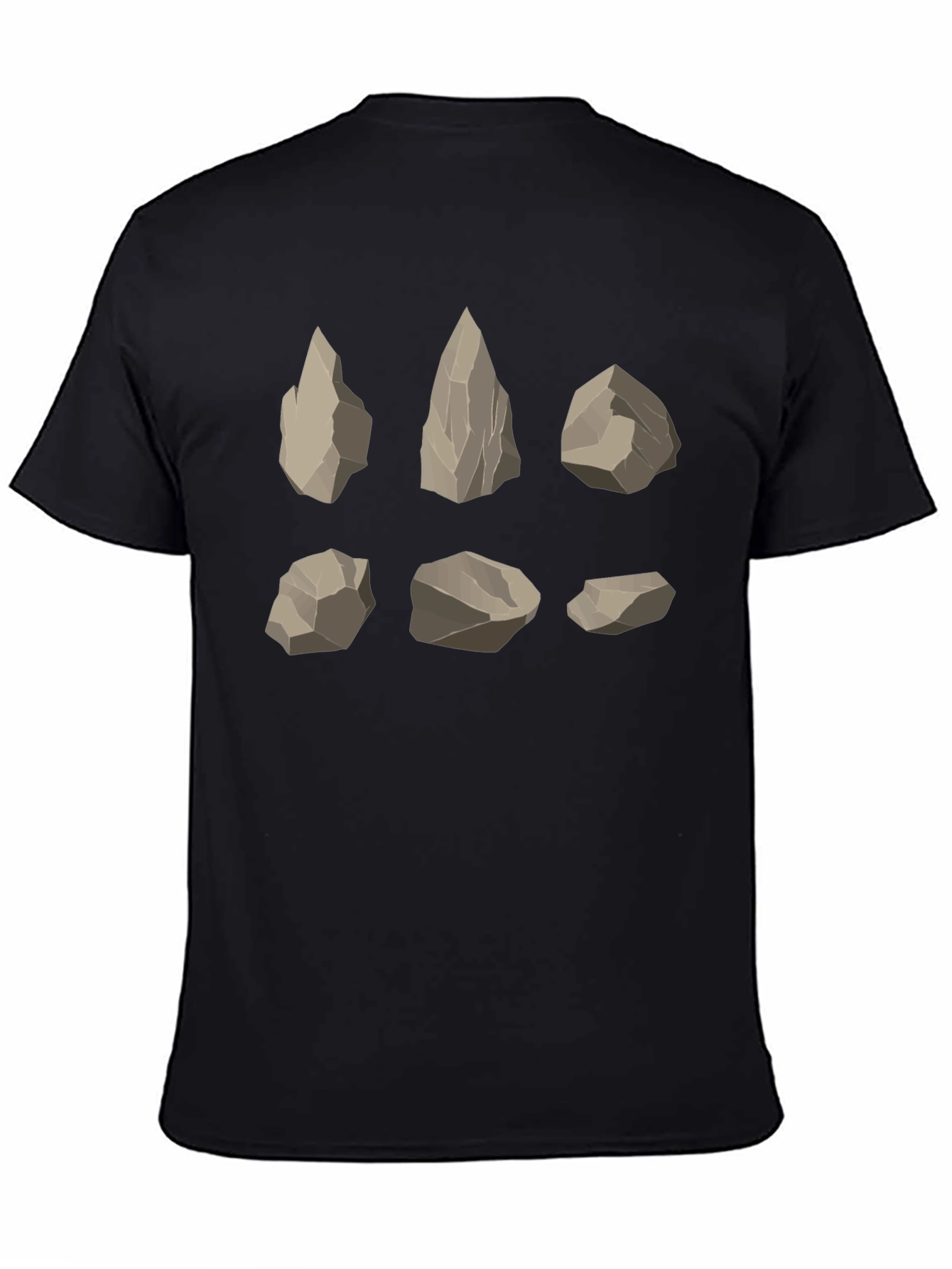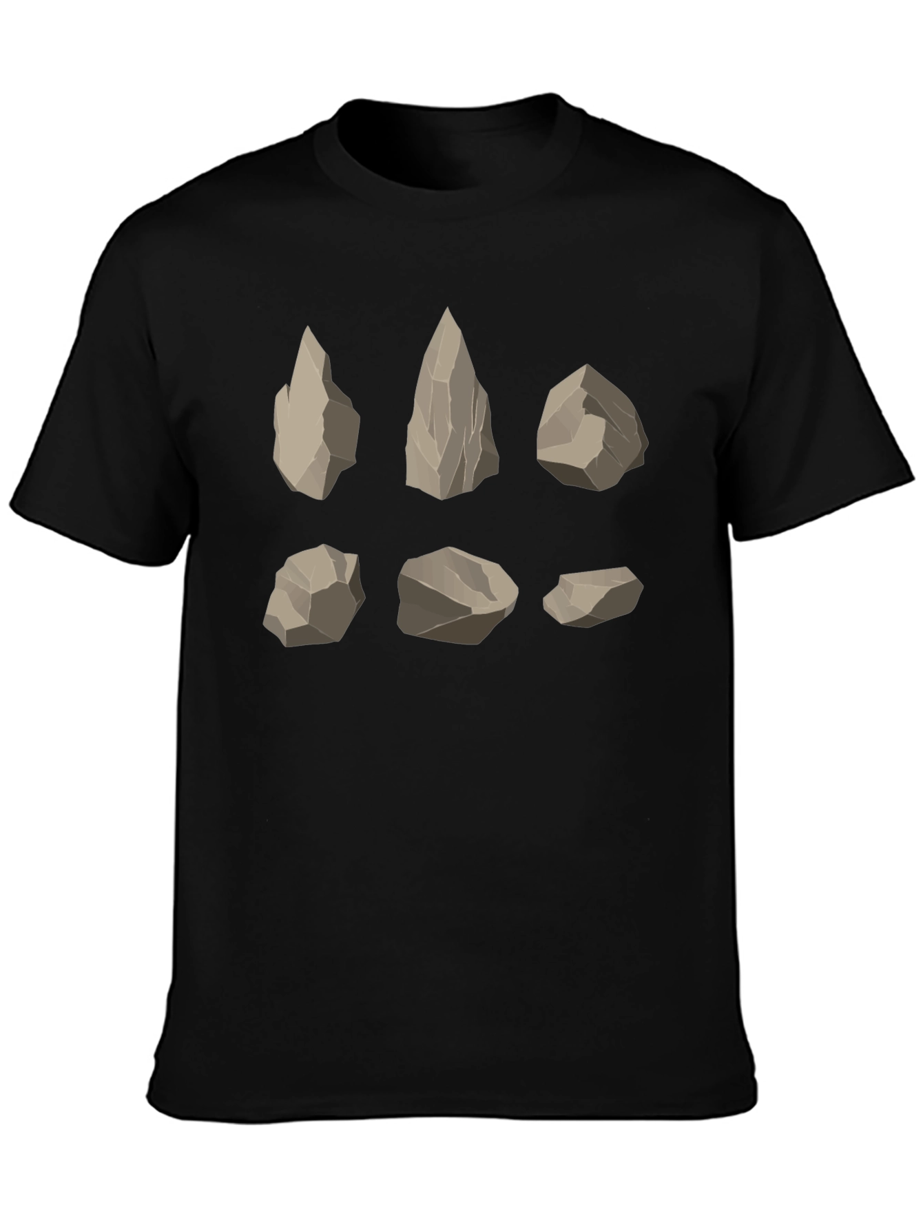 Showcase your love for geology or unique designs with this black t-shirt featuring a geometric rock formation graphic. The tee showcases a collection of various rock shapes and sizes, rendered in neutral gray tones, arranged across the chest. Crafted from a soft, breathable fabric, this t-shirt offers both comfort and style for everyday wear. Perfect for casual outings, nature enthusiasts, or anyone looking to add a touch of earthy charm to their wardrobe. This statement piece is sure to spark conversation and highlight your individual style.