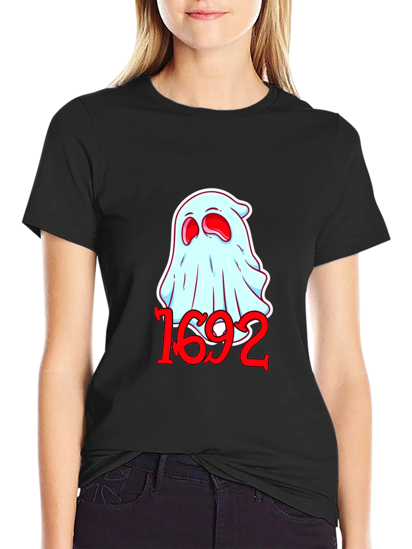 Get spooky with this black Halloween themed t-shirt. The shirt features a playful cartoon ghost graphic in the center with the number 1692 below. The ghost graphic is light blue with red eyes and a white outline. The numbers are in red, creating a contrast that makes the design pop. This comfortable tee is perfect for Halloween parties, casual wear, or showing off your festive spirit during the spooky season. Pair it with jeans for a relaxed look or dress it up for a Halloween event. A unique and eye-catching design, it will be a seasonal favorite!