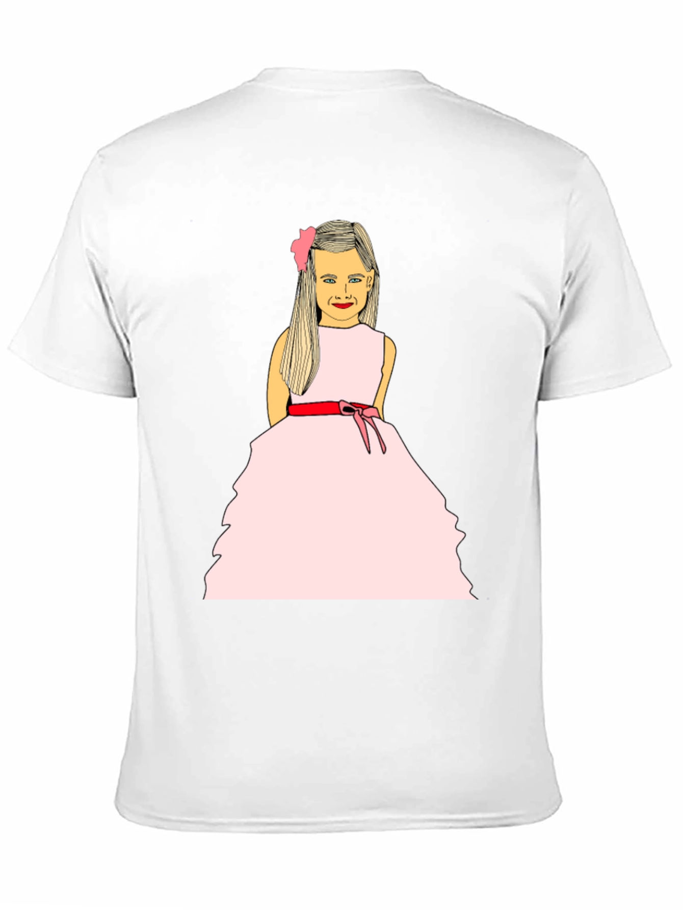 This eye-catching black t-shirt features a unique graphic of a young girl in a light pink dress. The dress is detailed with a red sash and matching bow. The graphic design has the look of a vintage illustration. The shirt is made from a soft, comfortable fabric. Perfect for casual wear, this t-shirt will add a touch of whimsy and charm to your wardrobe. Show off your unique style with this one-of-a-kind tee, a great addition to any collection. It is sure to attract attention and spark conversation wherever you go.