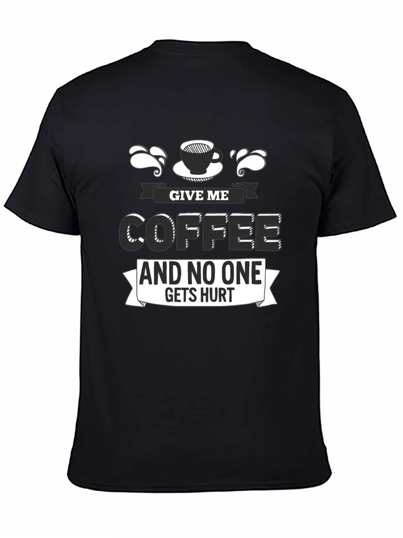 This black t-shirt features a humorous design for coffee lovers. The front of the shirt displays the phrase "GIVE ME COFFEE AND NO ONE GETS HURT" in bold, eye-catching lettering, accompanied by a coffee cup graphic and decorative accents. The shirt is made from a comfortable-looking fabric, perfect for casual wear. Show off your love for coffee and your sense of humor with this unique and stylish tee. Ideal for everyday wear, coffee shop visits, or as a gift for the coffee addict in your life. A definite conversation starter!