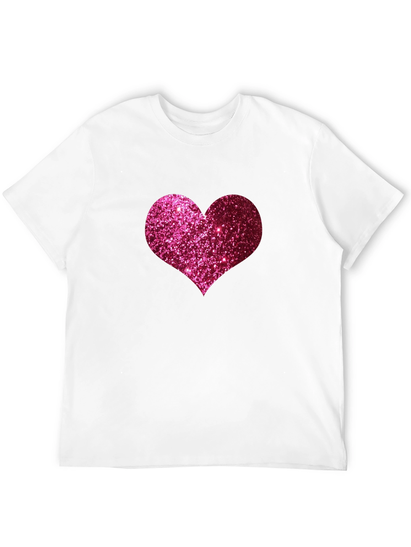 Show your love with this eye-catching black t-shirt featuring a large, dazzling pink glitter heart graphic. The tee is made from a comfortable, soft fabric that drapes well and is perfect for everyday wear. The vibrant glitter heart adds a touch of sparkle and fun, making it ideal for casual outings, parties, or simply expressing your personality. This statement piece effortlessly combines comfort and style, making it a must-have for any wardrobe. Stand out from the crowd and let your heart shine with this unique and fashionable graphic tee. Get ready to turn heads and spread the love!
