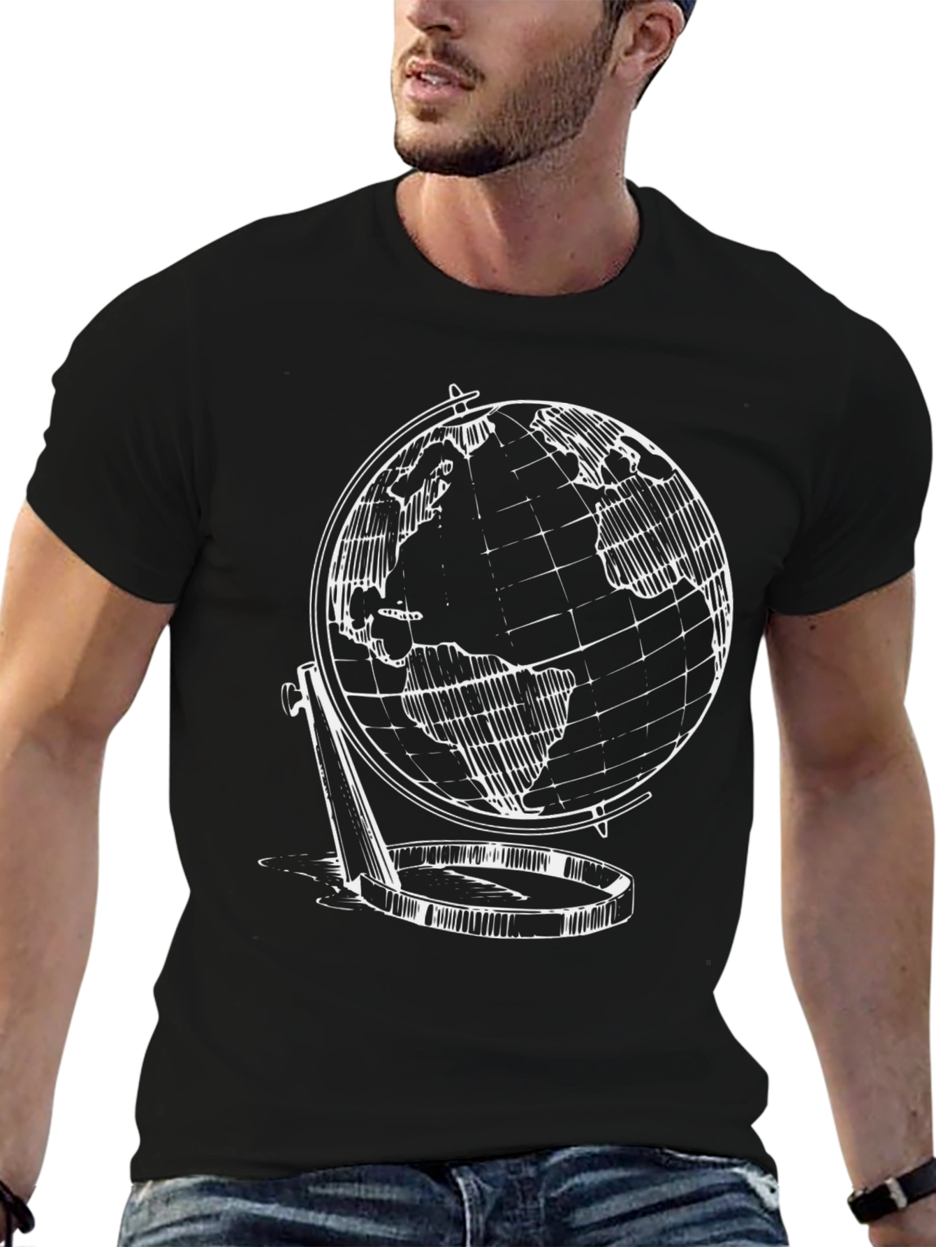 Show off your love for geography with this stylish black t-shirt. The shirt features a unique white graphic print of a globe. Made from comfortable, breathable cotton, this tee is perfect for everyday wear. The classic fit ensures a relaxed and flattering look for any body type. The striking globe design is sure to turn heads and start conversations. Whether you're a student, a traveler, or just a fan of cool graphics, this t-shirt is a must-have addition to your wardrobe. Pair it with jeans, shorts, or chinos for a versatile and casual style.