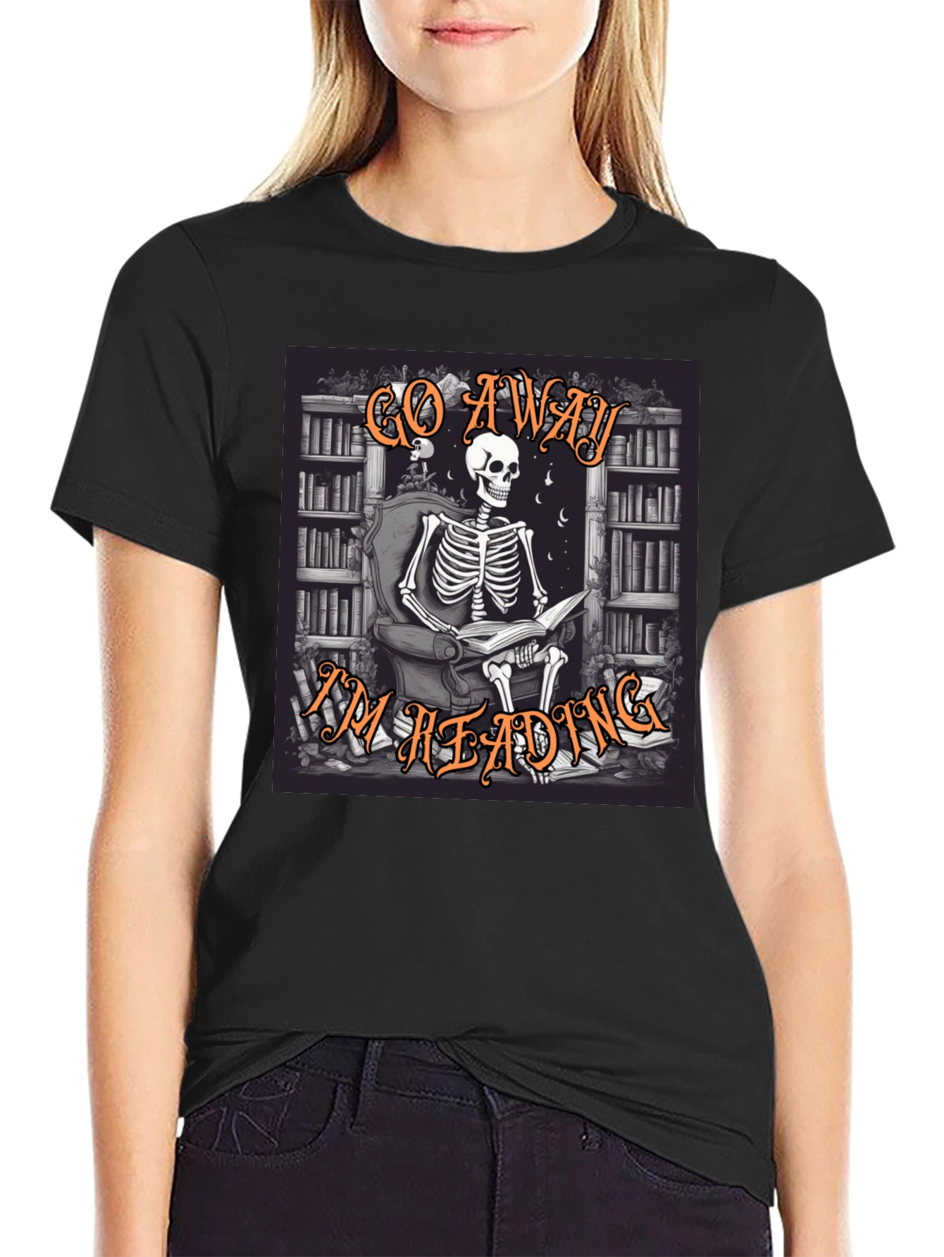 This unique black t-shirt features a captivating design of a skeleton engrossed in a book, seated in a cozy armchair amidst a backdrop of bookshelves. The phrase "Go Away I'm Reading" is prominently displayed, perfect for bookworms with a sense of humor. Made from a comfortable-looking fabric, this tee is ideal for casual wear, library visits, or literary events. Show off your love for reading with this eye-catching and conversation-starting t-shirt. A must-have for any book lover's wardrobe.