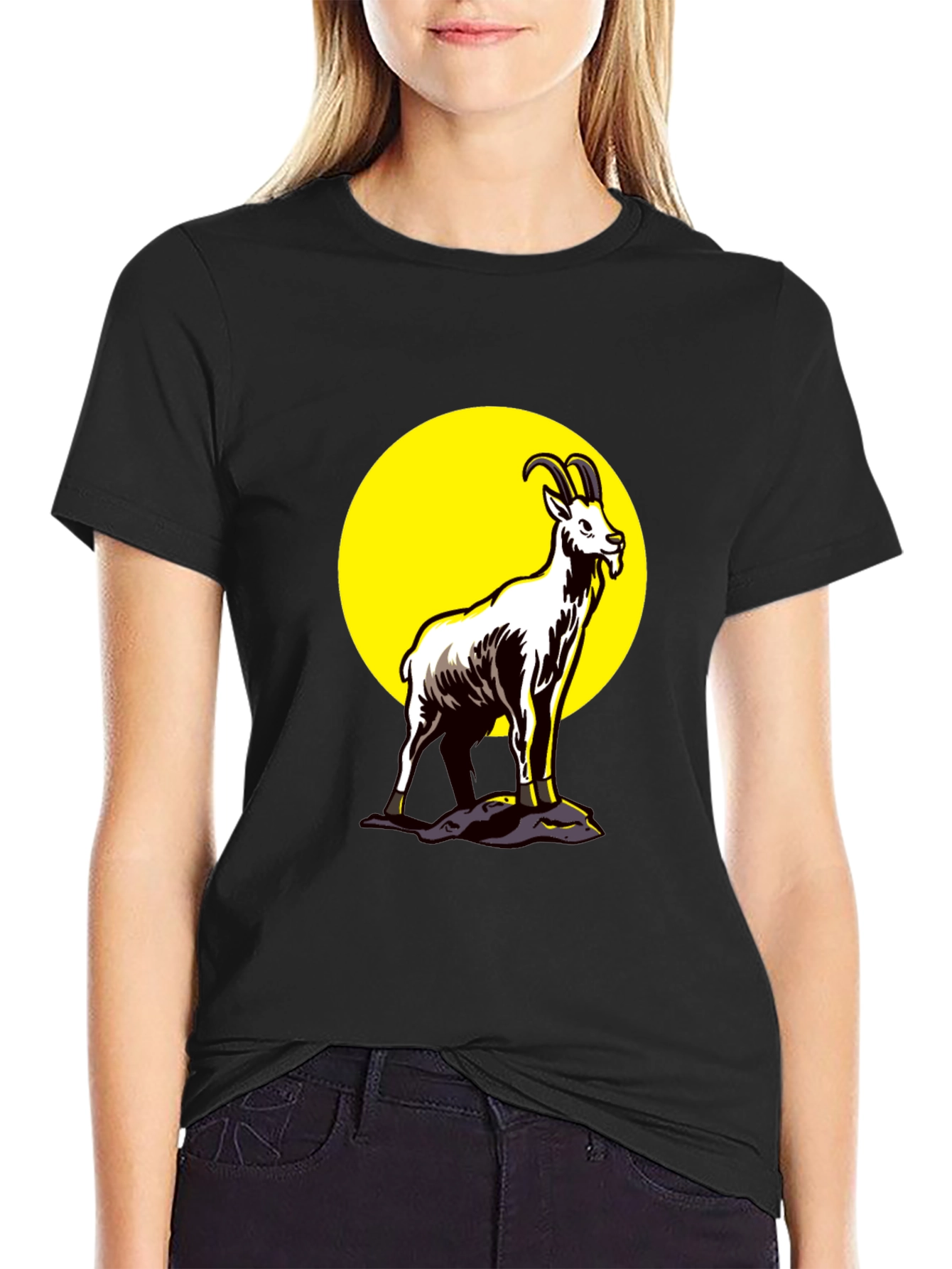 Show off your love for the outdoors with this stylish black t-shirt. Featuring a unique graphic design of a mountain goat standing proudly against a vibrant yellow moon, this tee is sure to turn heads. The design is striking and detailed, making it a standout piece in any casual wardrobe. Made from a comfortable, breathable fabric, this t-shirt is perfect for everyday wear. Whether you're hiking in the mountains or just hanging out with friends, this goat graphic t-shirt is a great way to express your personality and adventurous spirit. A must-have for animal lovers and outdoor enthusiasts alike!
