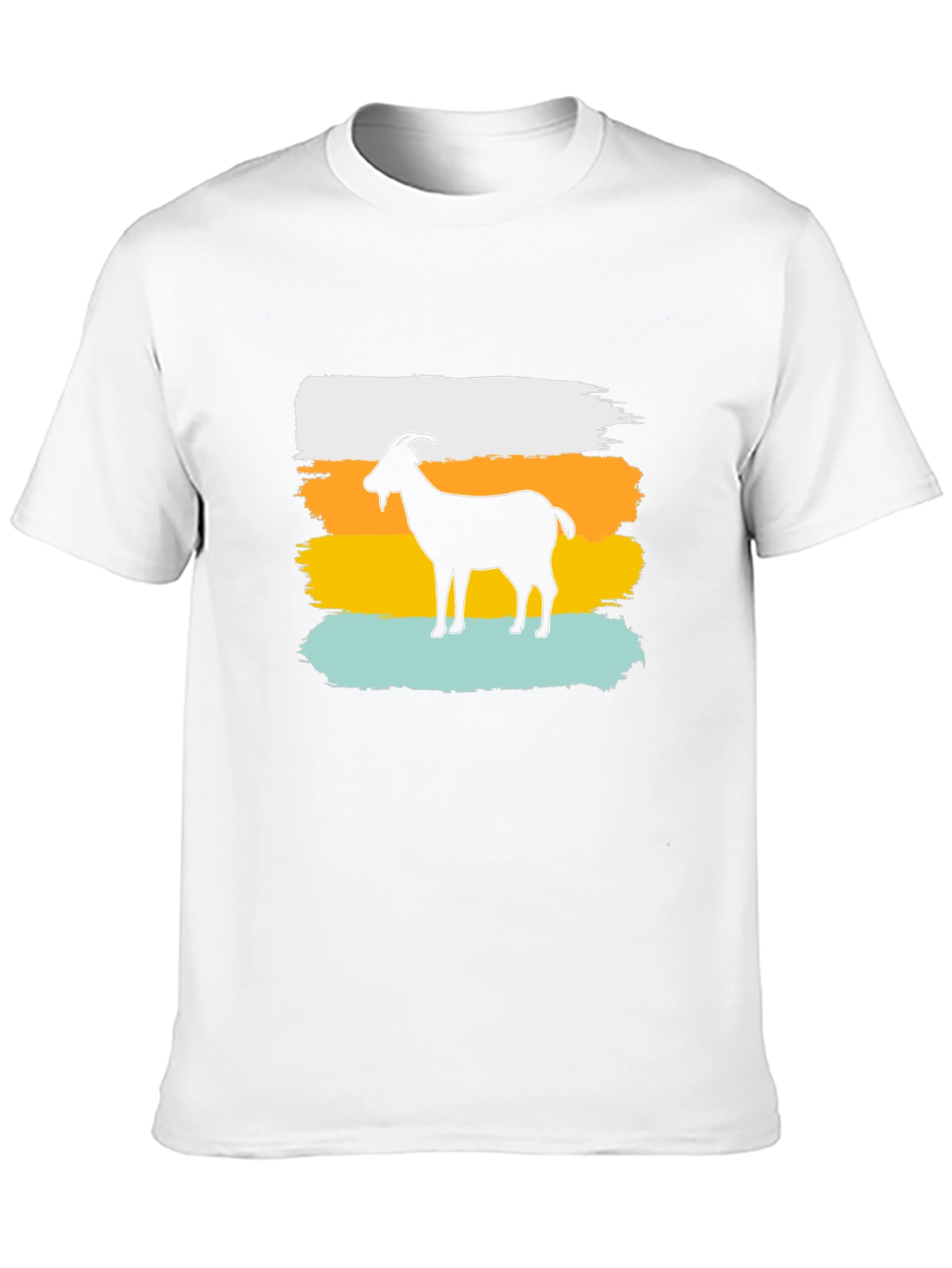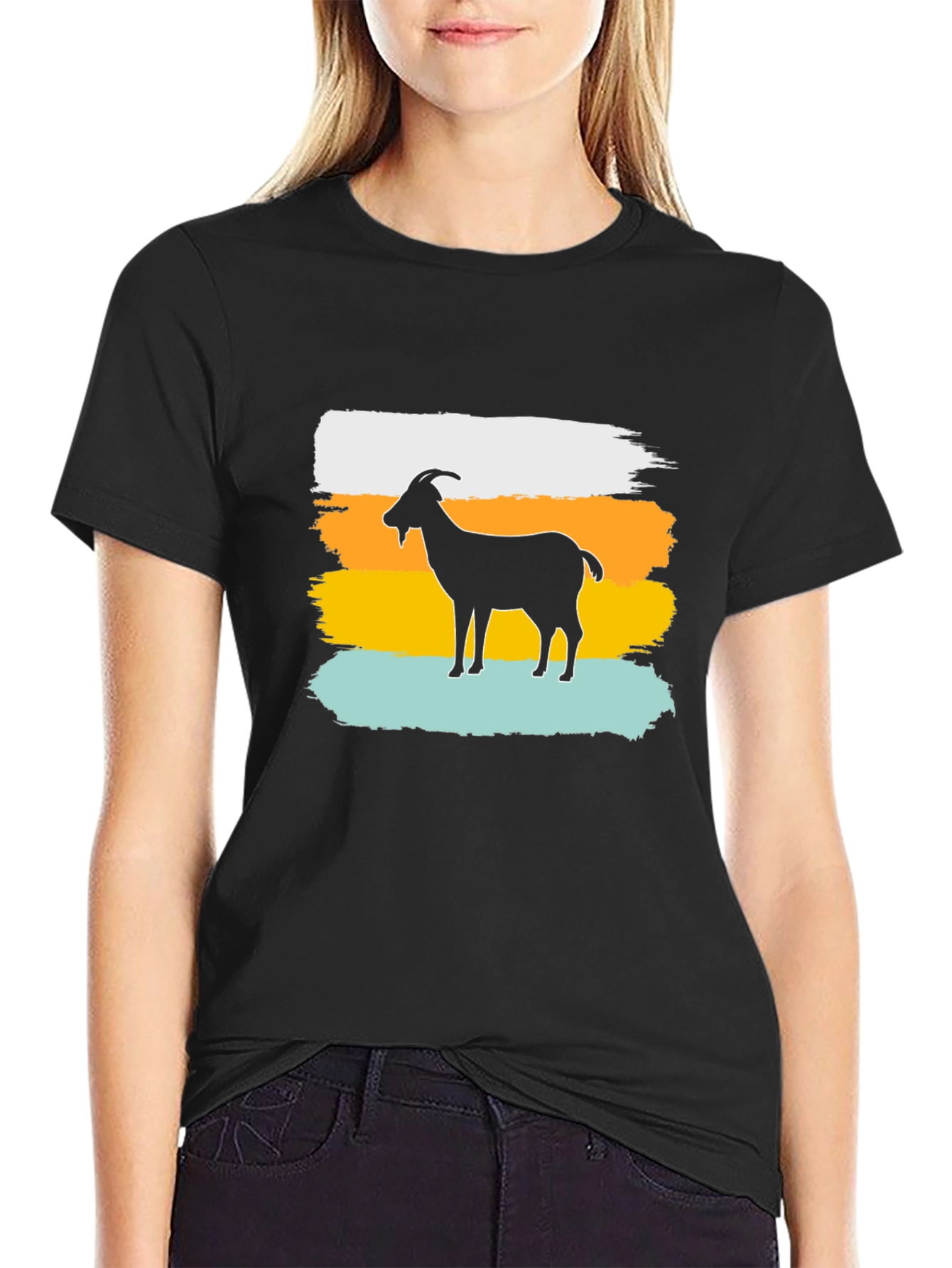 Show your love for goats with this stylish graphic t-shirt. The shirt features a bold black silhouette of a goat, set against a vibrant background of horizontal brush strokes in white, orange, yellow, and teal. This eye-catching design is printed on a comfortable, soft, black fabric, perfect for everyday wear. The classic crew neck and short sleeves make it a versatile addition to any wardrobe. Ideal for casual outings, farm visits, or simply expressing your unique personality. Stand out with this unique and trendy goat-themed tee!