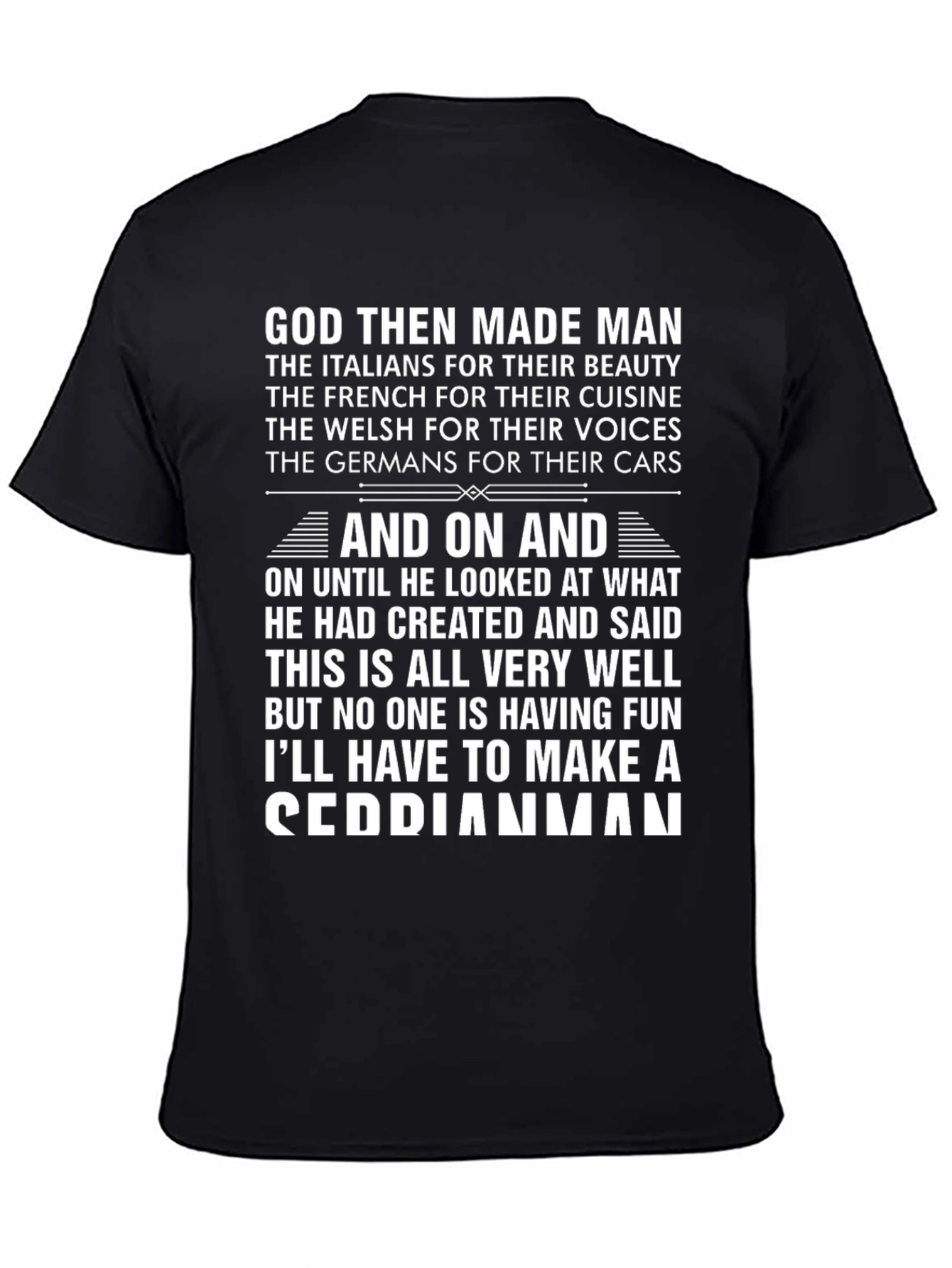 Show off your unique sense of humor with this eye-catching black t-shirt! The design features bold white text that humorously states, "GOD THEN MADE MAN, THE ITALIANS FOR THEIR BEAUTY, THE FRENCH FOR THEIR CUISINE, THE WELSH FOR THEIR VOICES, THE GERMANS FOR THEIR CARS, AND ON AND ON UNTIL HE LOOKED AT WHAT HE HAD CREATED AND SAID THIS IS ALL VERY WELL BUT NO ONE IS HAVING FUN I'LL HAVE TO MAKE A CEDRIC MAN.". Made from what appears to be a soft and comfortable cotton blend, this tee is perfect for casual wear. Its classic fit makes it a great addition to any wardrobe and a guaranteed conversation starter. Get yours today and spread some laughter!