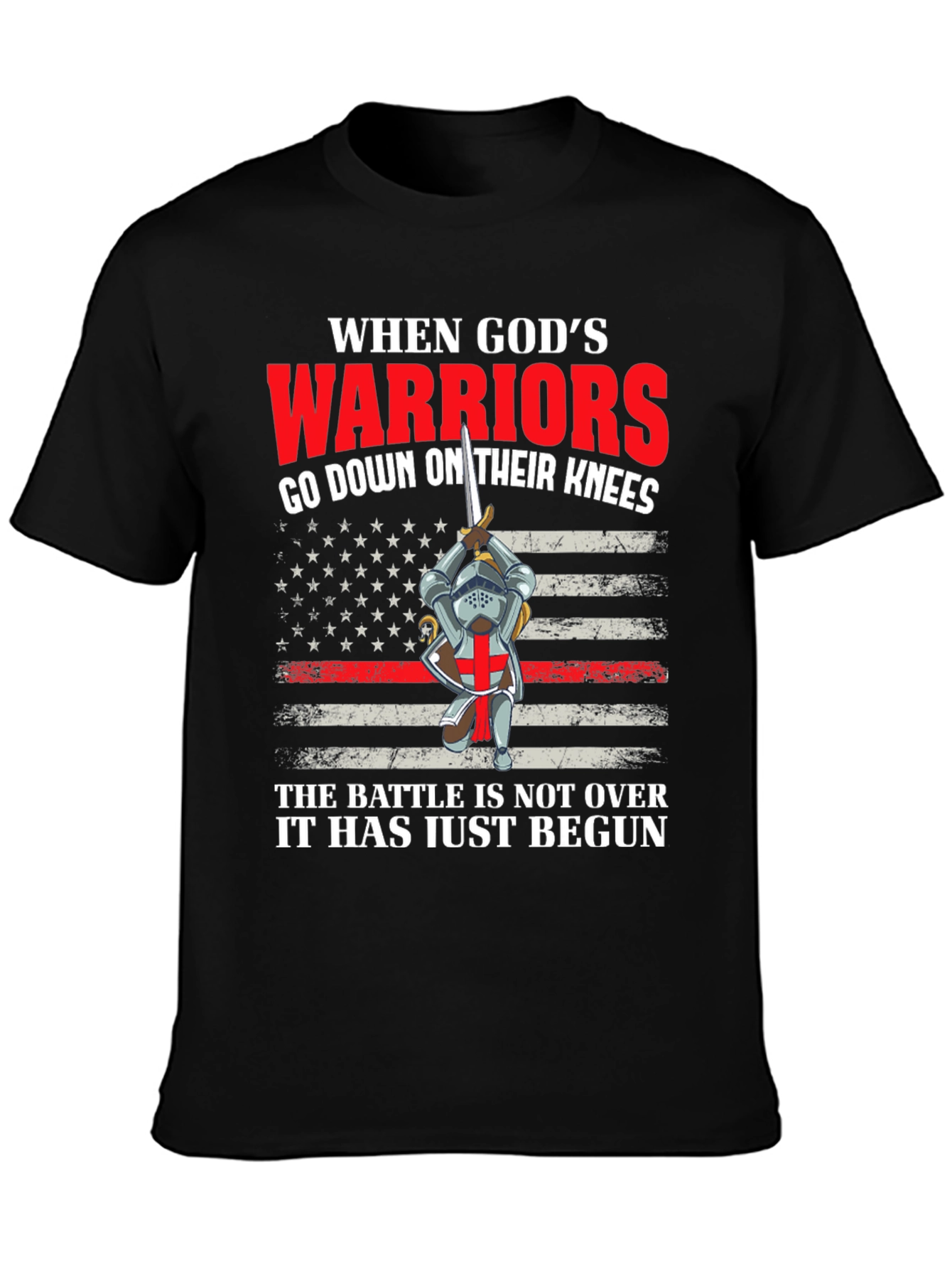 Show your faith with this striking black t-shirt. It features a bold graphic of a crusader knight kneeling in prayer before an American flag backdrop. The impactful text "WHEN GOD'S WARRIORS GO DOWN ON THEIR KNEES, THE BATTLE IS NOT OVER IT HAS JUST BEGUN" makes a powerful statement. The design is printed in red and white for high contrast. Made from comfortable materials, this tee is perfect for casual wear, religious gatherings, or expressing your beliefs. A unique and meaningful addition to any wardrobe.