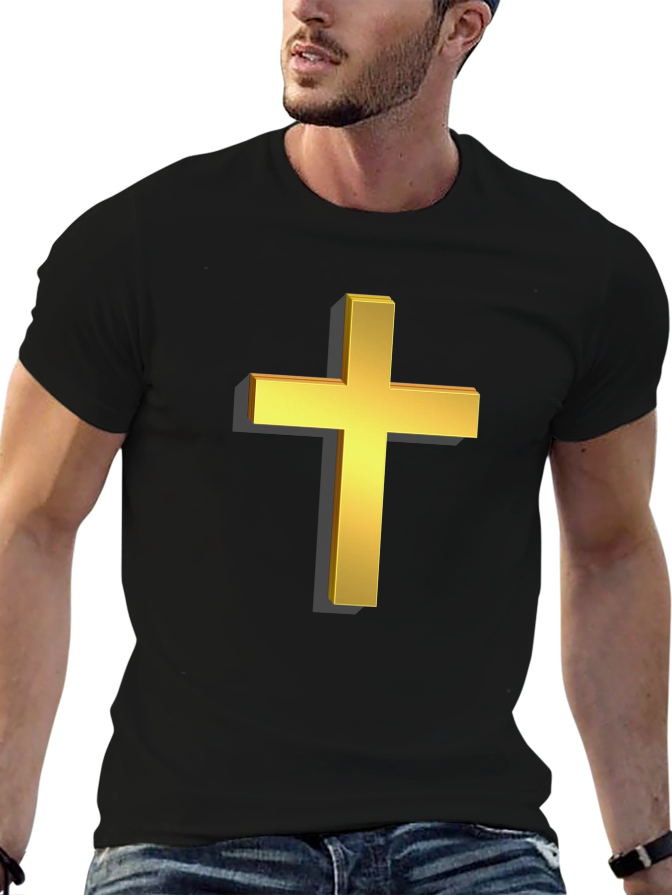 Show your faith with this striking black t-shirt! This classic tee features a bold, 3D-rendered golden cross graphic prominently displayed on the chest. The design offers a stylish and subtle way to express your beliefs. Made from what appears to be a soft, comfortable cotton blend, this short-sleeved shirt is perfect for everyday wear. Whether you're heading to church, hanging out with friends, or simply running errands, this t-shirt provides a comfortable fit and a meaningful statement. A versatile addition to any wardrobe.