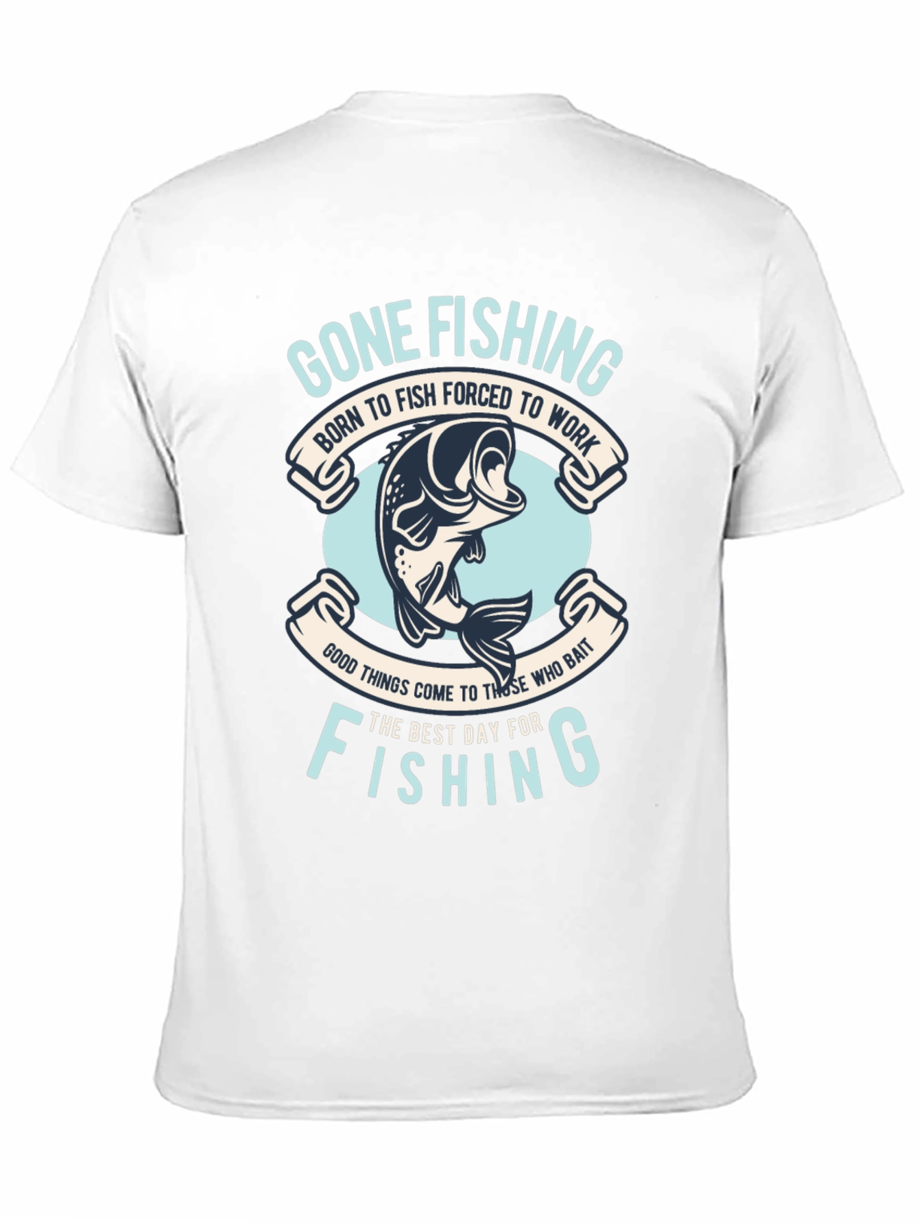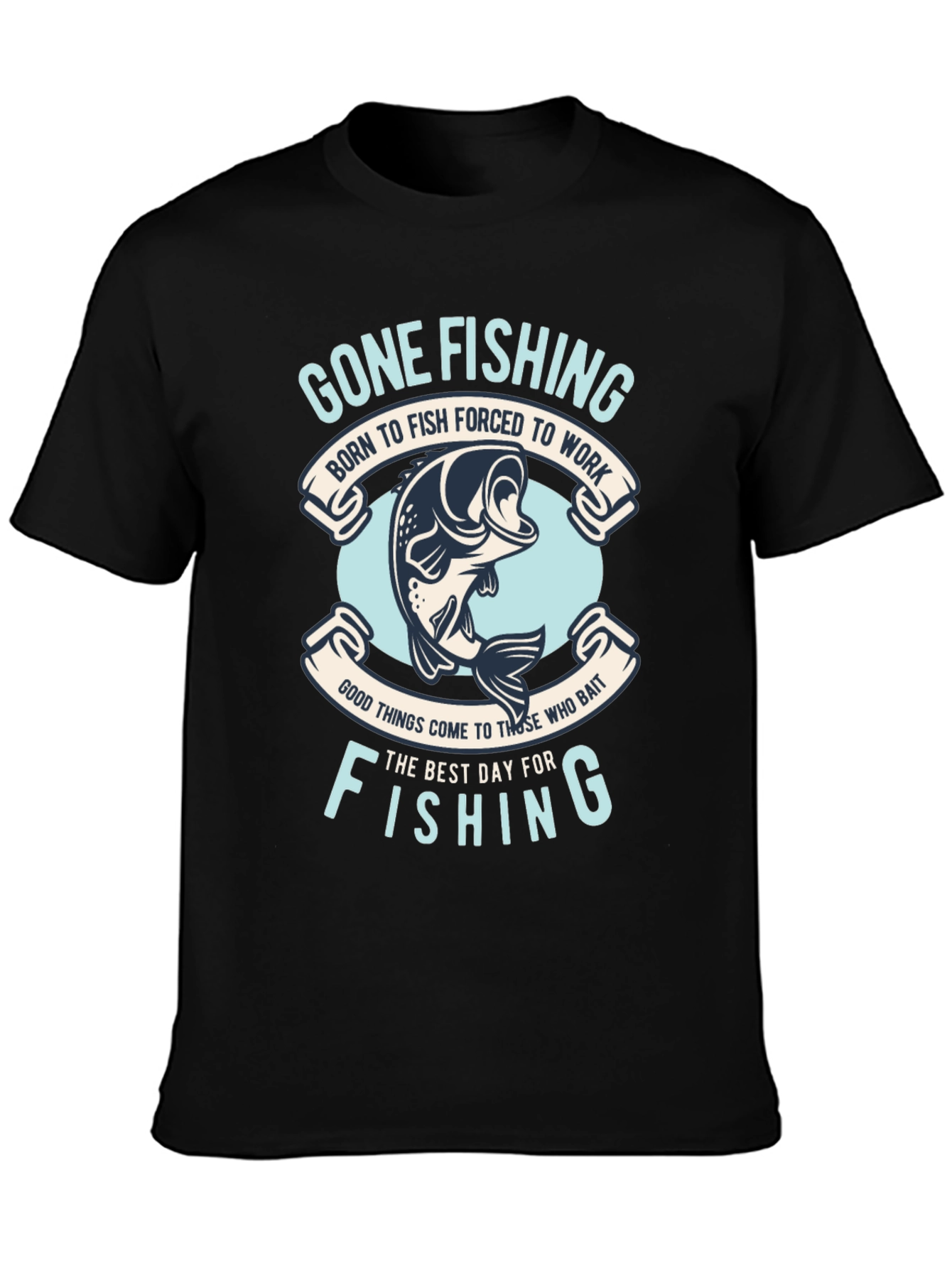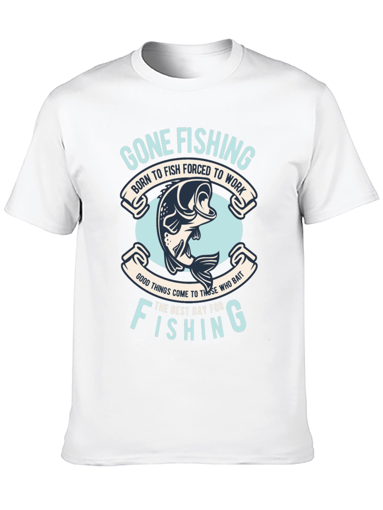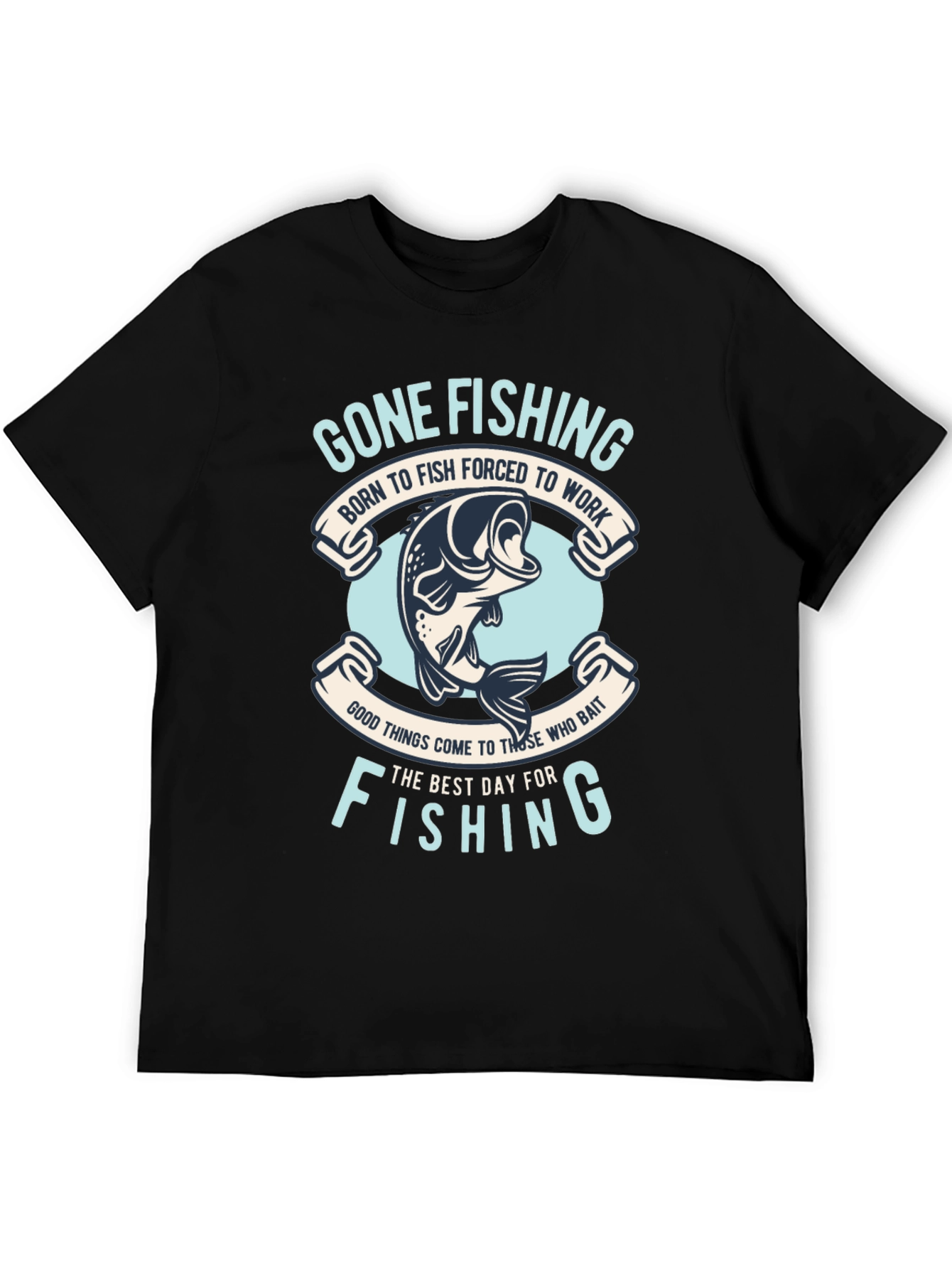Show off your love for fishing with this awesome graphic tee! This t-shirt features a bold design with the phrase 'Gone Fishing' and a detailed graphic of a leaping fish. The text 'Born to Fish Forced to Work' and 'The Best Day For Fishing' add a playful touch. Made from comfortable, breathable fabric, this tee is perfect for everyday wear or your next fishing trip. Whether you're casting lines or relaxing by the water, this t-shirt is a great way to express your passion for fishing. A must-have for any angler!