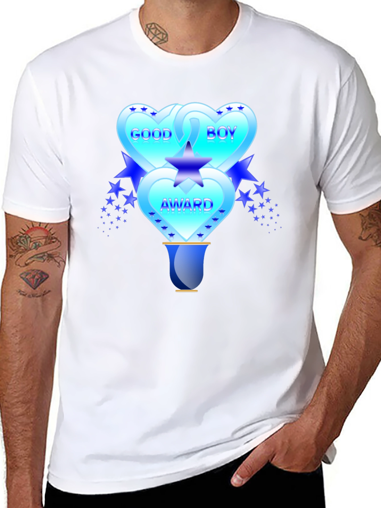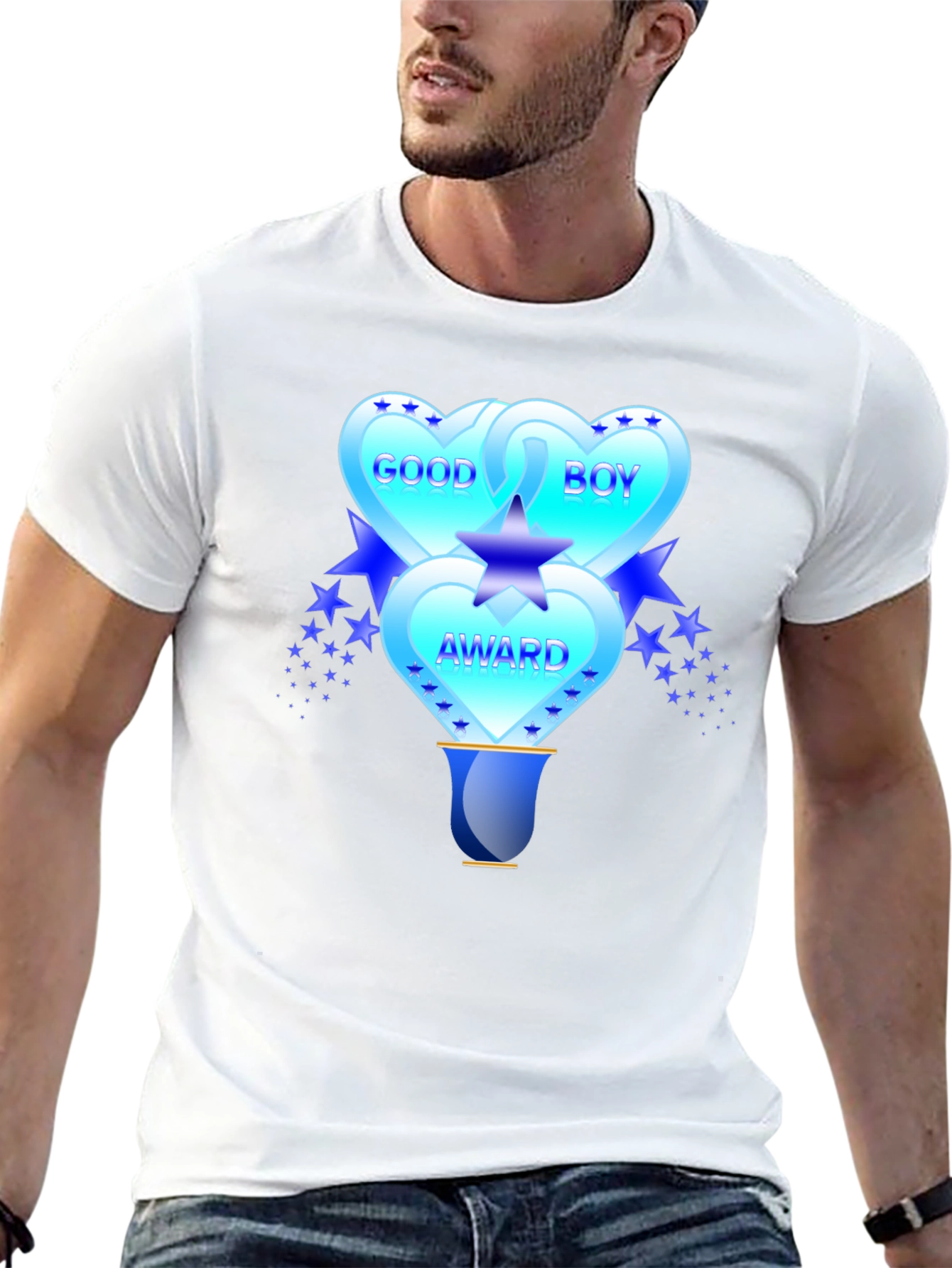 Show off your playful side with this eye-catching men's black graphic tee! The shirt features a fun and unique 'Good Boy Award' design, with light blue hearts, blue stars, and a trophy cup. The graphic is vibrant and detailed, creating a striking focal point on the classic black background. Made from soft, breathable fabric, this t-shirt ensures all-day comfort. Ideal for casual outings, relaxed weekends, or as a humorous gift, this t-shirt adds a touch of personality to any wardrobe. Stand out from the crowd and let your fun side shine with this must-have tee!