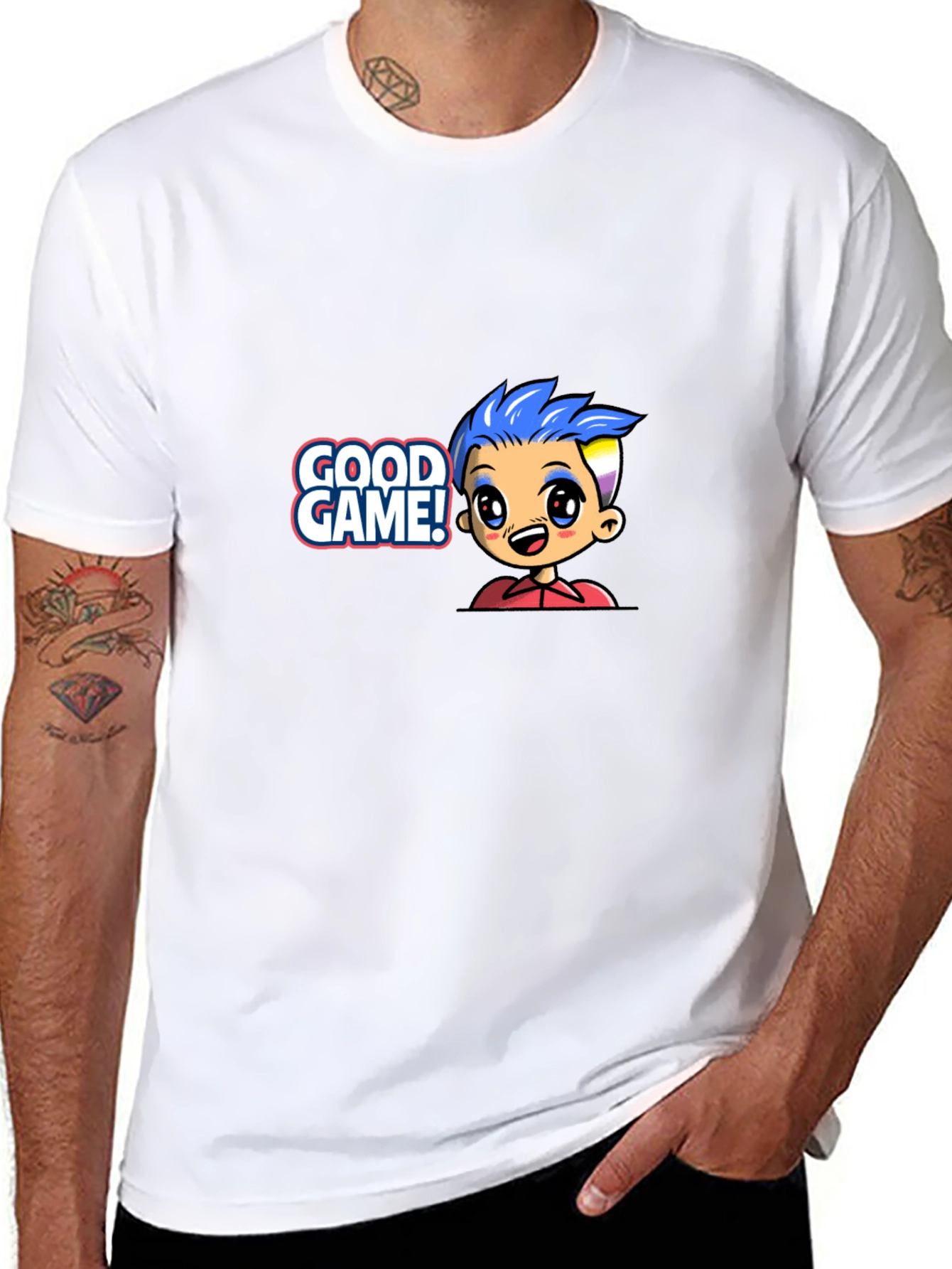Level up your style with this fun 'Good Game' t-shirt! Featuring a vibrant cartoon character, this black tee is perfect for gamers and anyone who loves playful designs. The eye-catching graphic adds a pop of color to your casual wardrobe. Made from comfortable materials, this shirt is ideal for everyday wear, gaming sessions, or hanging out with friends. Show off your gaming enthusiasm with this unique and expressive tee. Grab yours now and let the good times roll!