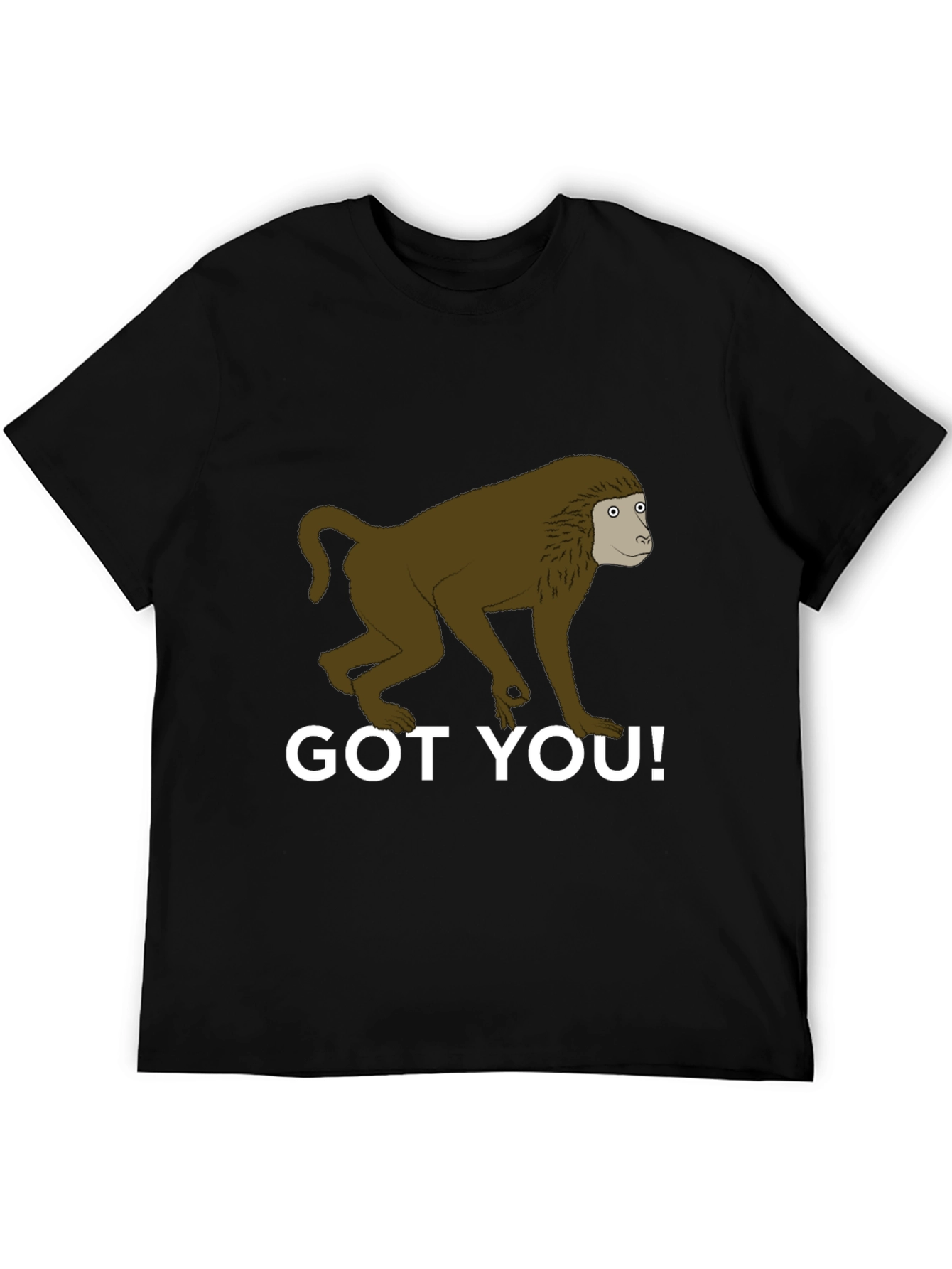 Show off your playful side with this eye-catching graphic tee! Featuring a unique cartoon monkey illustration and the text "GOT YOU!", this t-shirt is sure to spark conversations. The design is printed on a comfortable black fabric, offering a classic fit that's perfect for casual wear. Made from soft, breathable materials, it's ideal for everyday comfort. Whether you're looking for a fun addition to your wardrobe or a quirky gift for a friend, this novelty tee is an excellent choice. Express your humor and stand out from the crowd with this one-of-a-kind design!