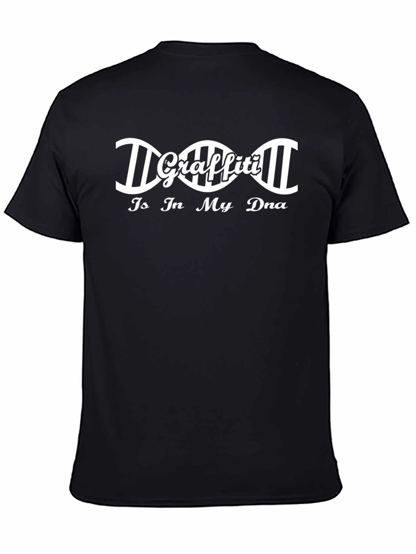 Express your unique style with this black t-shirt featuring a bold graphic design. The eye-catching white print showcases a creative "Graffiti Is In My DNA" slogan intertwined with a DNA double helix symbol. Made from a comfortable, breathable fabric, this tee offers a relaxed fit perfect for everyday wear. Ideal for casual outings, street style looks, or as a statement piece, this t-shirt lets you showcase your personality. Pair it with jeans, shorts, or joggers for a versatile and trendy ensemble. Add a touch of artistic flair to your wardrobe with this distinctive design.