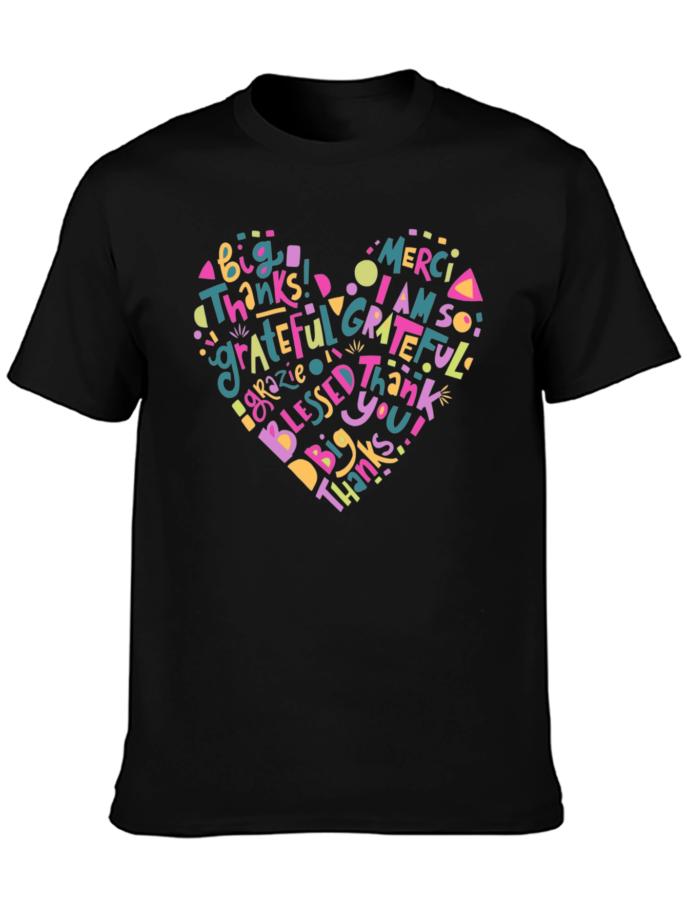 Show your gratitude with this eye-catching black t-shirt featuring a vibrant heart-shaped design. Filled with words of appreciation like 'Grateful,' 'Thankful,' and 'Blessed' in a variety of playful fonts and colors, this shirt is a joyful way to express positivity. The design creates a visually appealing statement, perfect for everyday wear, Thanksgiving gatherings, or as a thoughtful gift. Made from a comfortable and breathable fabric, this t-shirt offers a relaxed fit and is suitable for all-day wear. Spread joy and gratitude wherever you go with this unique and stylish graphic tee.