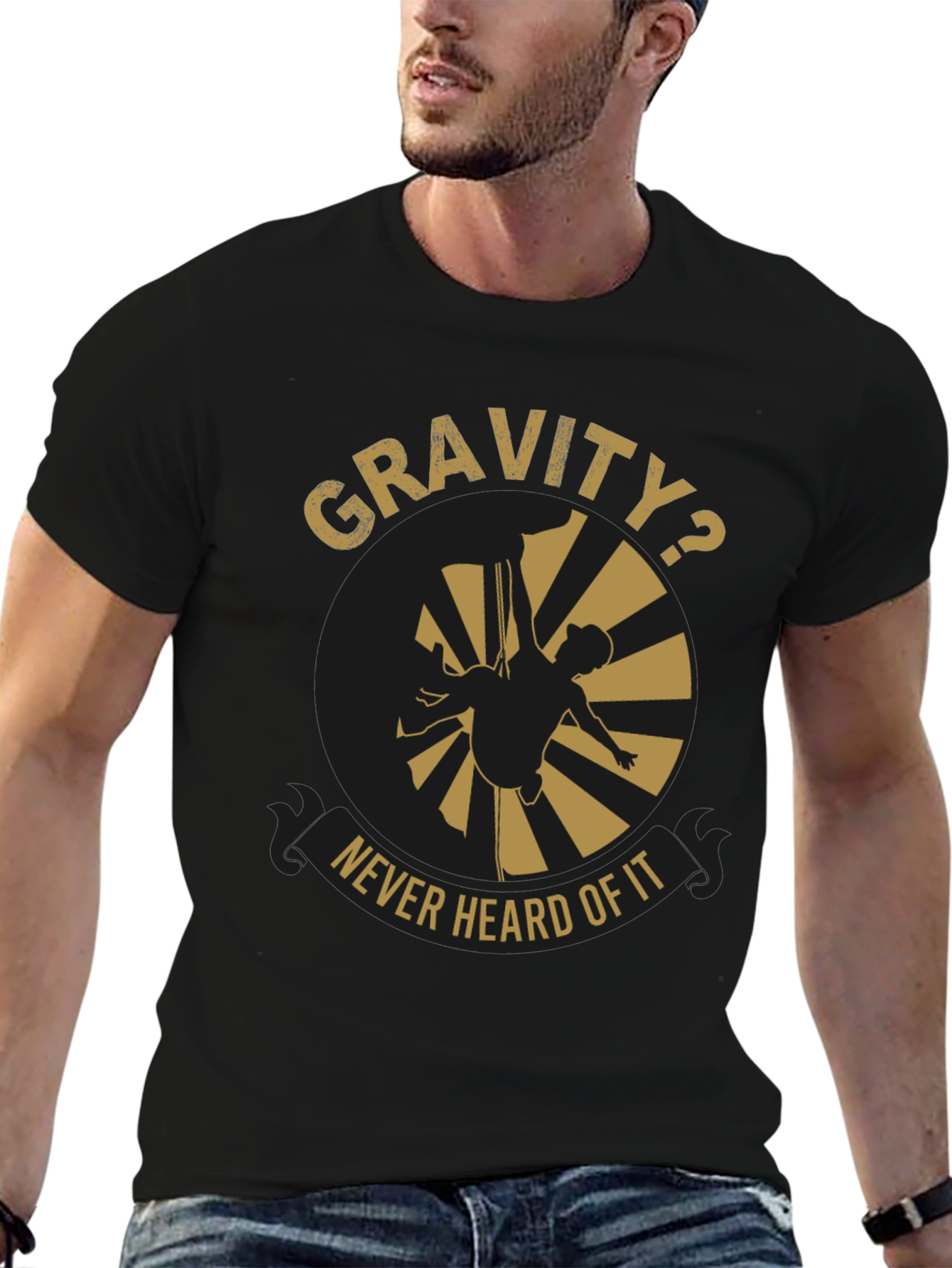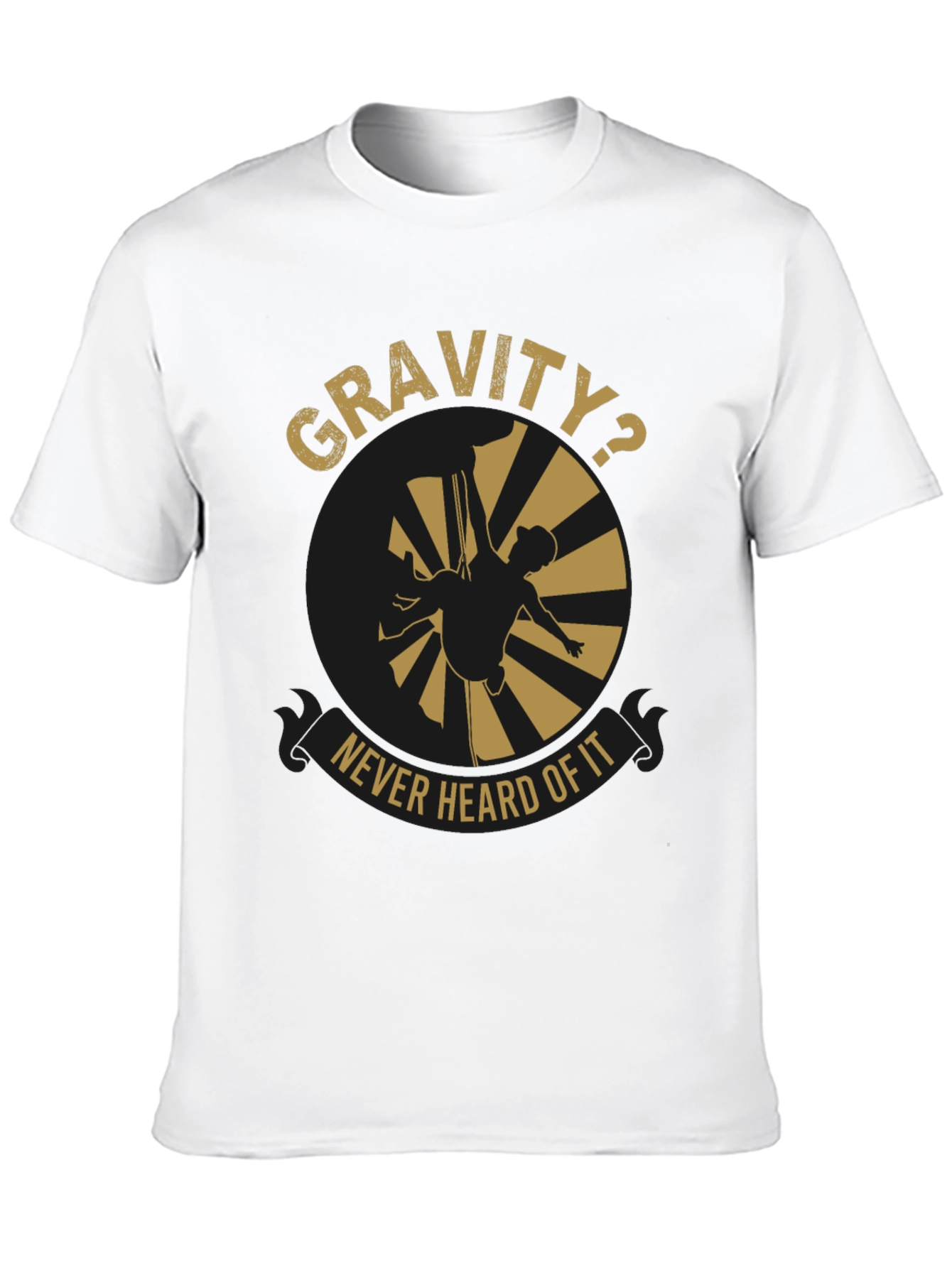Defy expectations with this striking black T-shirt, featuring a bold graphic design. The focal point is a stylized image of a pole dancer, playfully challenging the laws of physics with the words "Gravity? Never Heard Of It" encircling the design. The print is golden, providing contrast to the dark background. Crafted from a comfortable material, this short-sleeved tee is perfect for everyday wear, whether you're hitting the gym, hanging out with friends, or expressing your unique sense of humor. It's a great conversation starter and a fun way to showcase your personality. Get yours today!