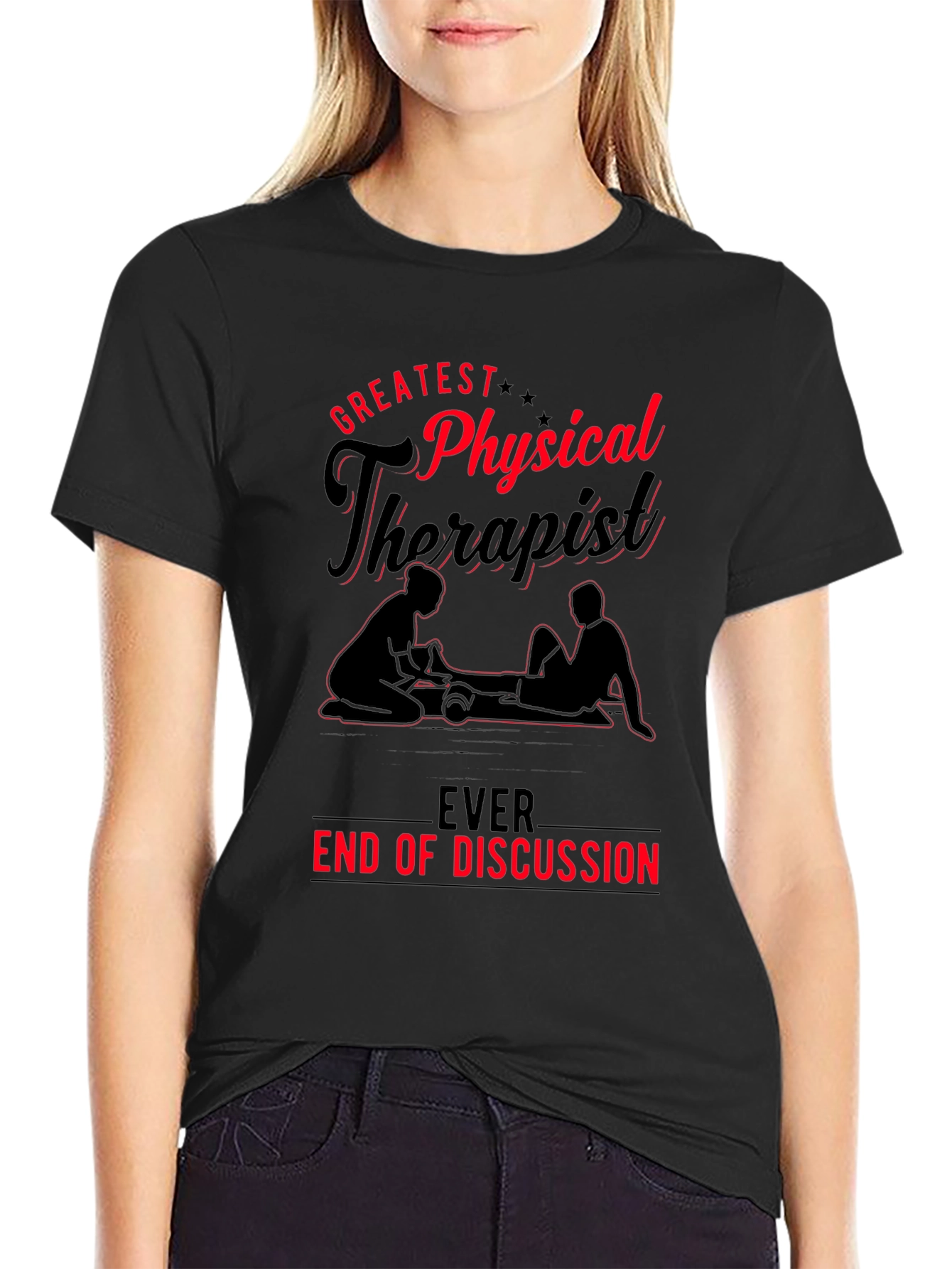 Show your appreciation for physical therapists with this unique black t-shirt. The design features the phrase "Greatest Physical Therapist EVER END OF DISCUSSION" in eye-catching red lettering, complemented by a silhouette graphic depicting a therapist assisting a patient. Perfect for wearing at the clinic, gym, or just casually to display your pride in the profession. Made from what appears to be a comfortable, breathable fabric, this t-shirt combines style and comfort. A great conversation starter and a wonderful gift for any dedicated physical therapist!