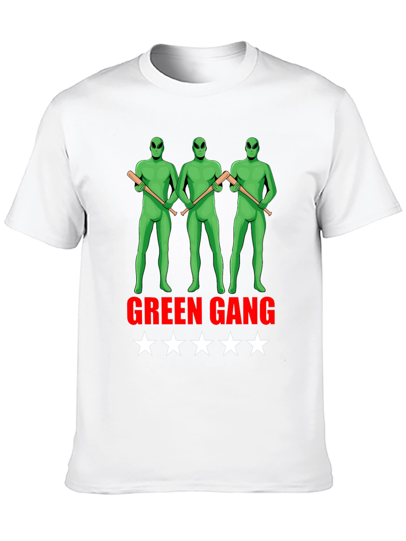 Show your unique sense of humor and love for extraterrestrial lore with this one-of-a-kind "Green Gang" t-shirt. Crafted from soft, breathable fabric, this black tee features a striking graphic of three green aliens holding baseball bats. The bold "GREEN GANG" text, combined with five white stars, adds a playful touch. Perfect for casual outings, parties, or sparking conversations, this shirt is designed to stand out. Wear it proudly to express your individual style and spread some laughs. This eye-catching design is sure to become a favorite in your wardrobe. Comfortable and stylish, it's a must-have for any alien enthusiast or anyone who loves quirky graphic tees.
