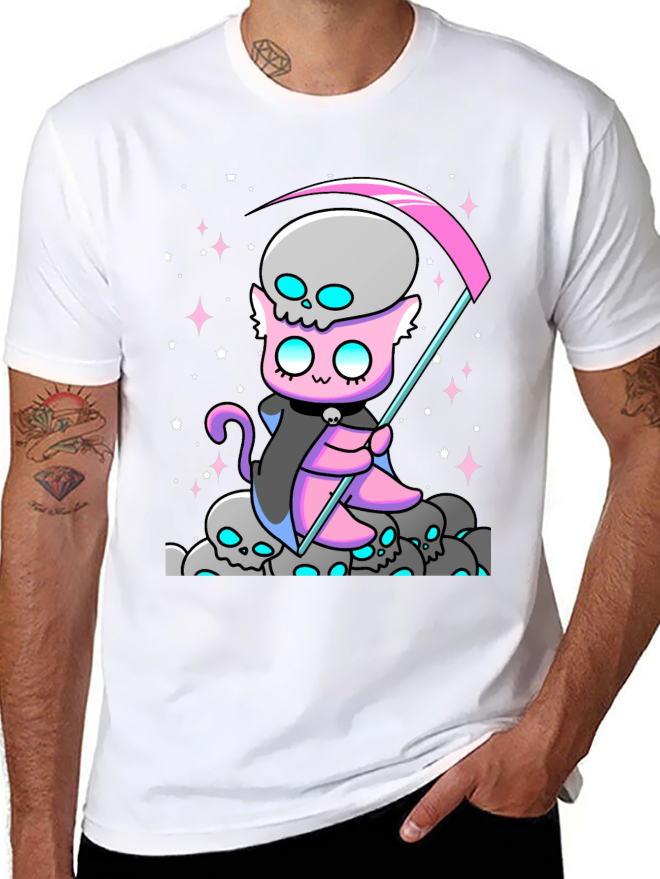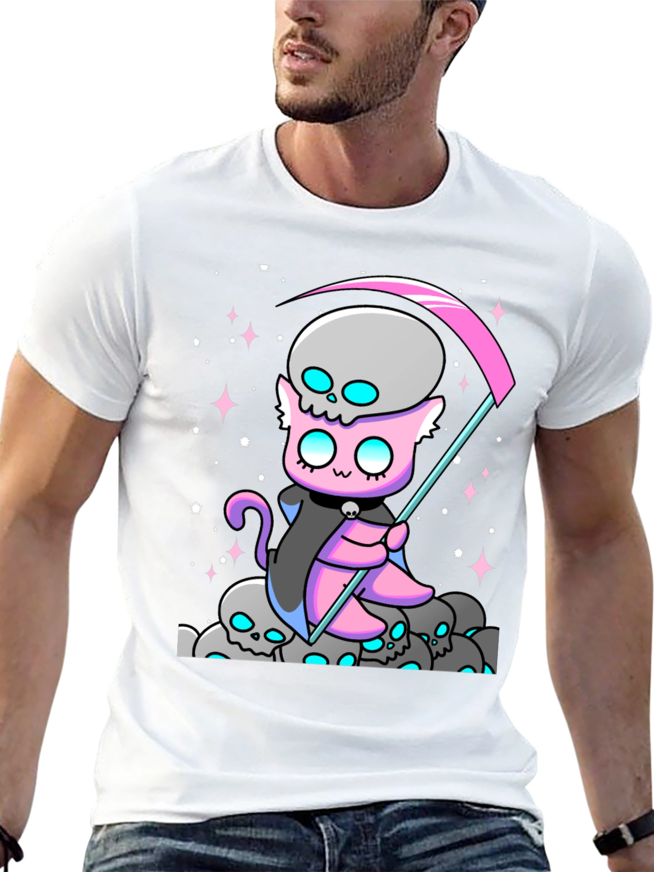 This unique t-shirt features a playful yet edgy design of a cartoon cat dressed as the grim reaper. The cat is perched atop a pile of skulls. Its robe is black and it holds a light pink scythe. The design is complete with small pink stars. The t-shirt is made from comfortable material. The design is great for everyday wear and can easily be styled with jeans, shorts, or a skirt. This shirt is perfect for those who love cats, gothic aesthetics, and unique graphic tees.