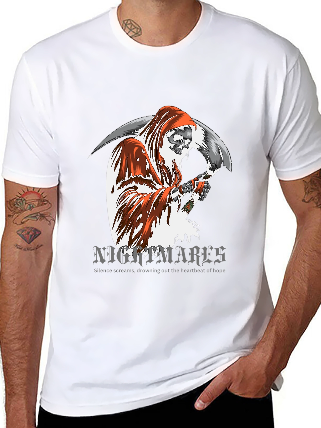 Embrace the darkness with this striking Grim Reaper t-shirt. Crafted from soft, breathable cotton, this black tee features a bold graphic print of the Grim Reaper, scythe in hand, amidst a chilling "Nightmares" design. The detailed artwork is sure to turn heads and spark conversation. Perfect for those who appreciate gothic or edgy style, this unisex shirt can be dressed up or down. Wear it to concerts, casual outings, or as a statement piece in your everyday wardrobe. Comfortable, stylish, and undeniably cool.