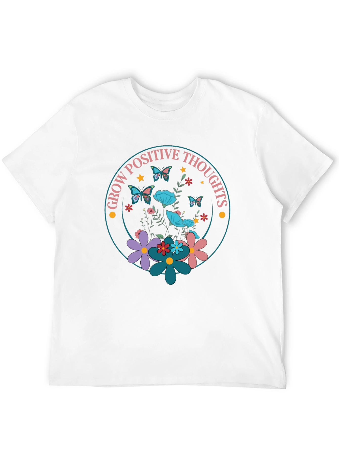 Radiate positivity in our Grow Positive Thoughts T-Shirt. The design features a vibrant floral circle with flowers, butterflies, and the uplifting message "Grow Positive Thoughts". This black tee is made from a soft, comfortable fabric, perfect for everyday wear. The eye-catching design adds a touch of whimsy to any outfit. Wear this shirt to spread good vibes and inspire those around you. Ideal for casual outings, yoga sessions, or simply lounging at home. It's a fashionable way to promote mindfulness and optimism. A must-have for anyone who believes in the power of positive thinking.