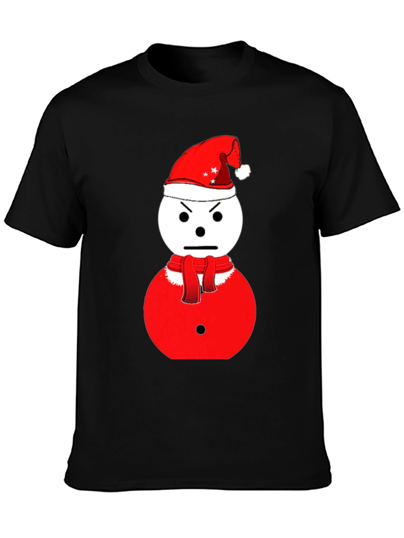 Spread some holiday cheer with this unique black t-shirt featuring a grumpy snowman design. The snowman sports a classic red Santa hat and matching scarf, giving a fun twist to the traditional Christmas theme. Its simple design, with a single black button, makes this shirt a real conversation starter. Made from comfortable material, this t-shirt is perfect for casual wear during the festive season, Christmas parties, or as a quirky gift for friends and family with a sense of humor. This shirt offers a blend of style, comfort, and holiday spirit, making it a festive addition to your wardrobe. Rock your holiday with this unique grumpy snowman tee!