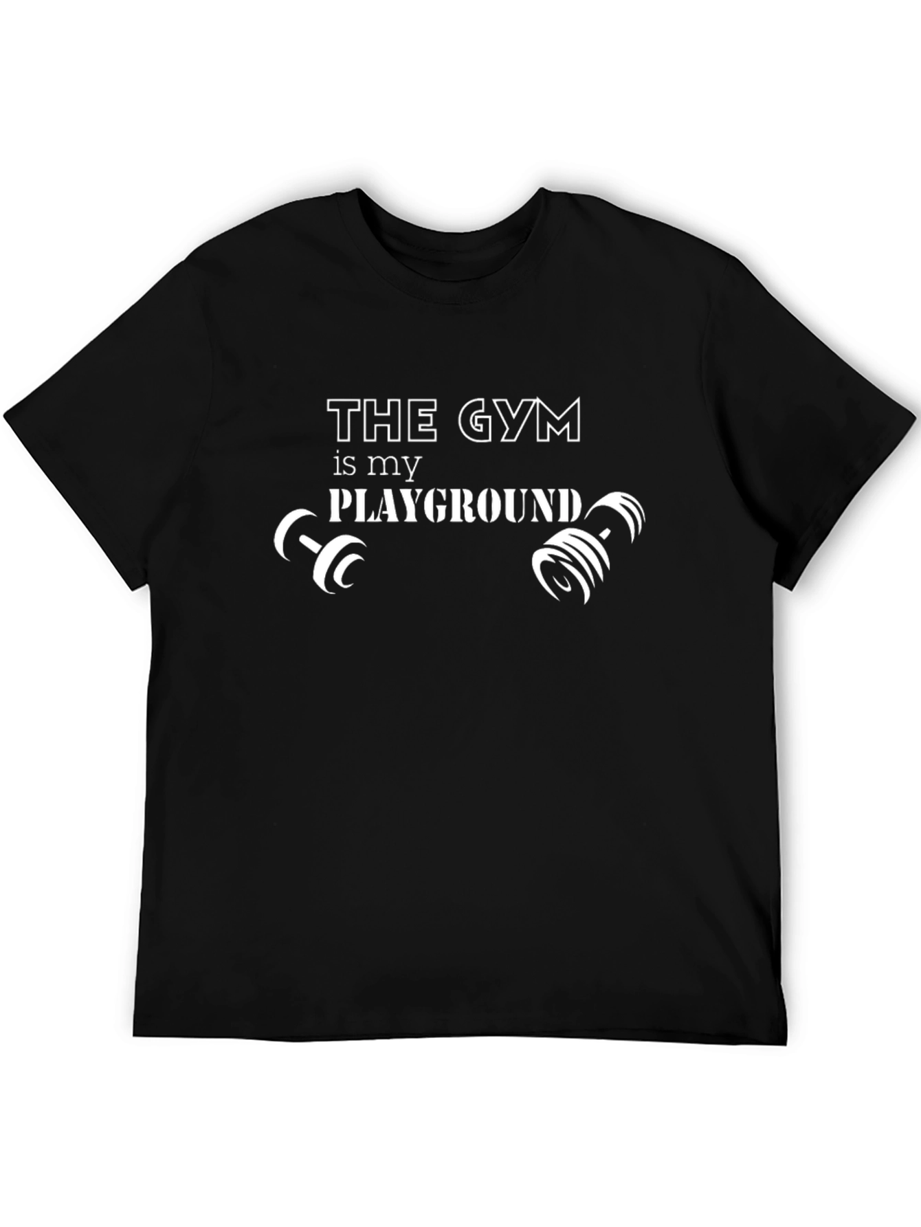 Show off your passion for fitness with this stylish black t-shirt. This tee features a bold "THE GYM is my PLAYGROUND" design printed in crisp white font, accompanied by graphic dumbbell illustrations. Made from a comfortable-looking fabric, this shirt is perfect for wearing during workouts or as a casual everyday outfit. Make a statement about your commitment to health and fitness with this must-have addition to your wardrobe. Grab yours today and let everyone know where your happy place is!