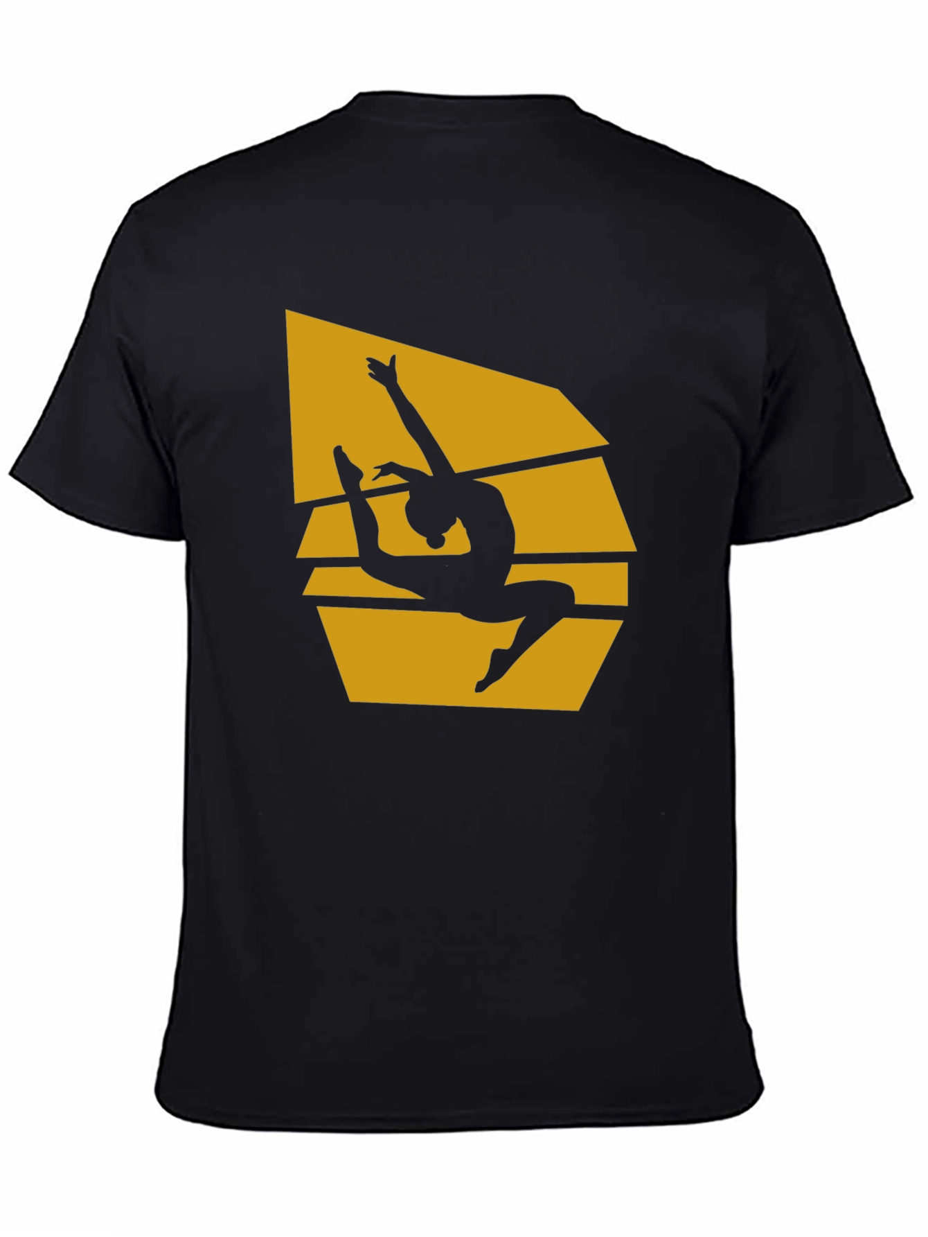 Showcase your love for gymnastics with this stylish black t-shirt. Featuring a bold, eye-catching gold graphic, this tee depicts a gymnast in action against a modern, geometric background. The shirt appears to be made from soft, breathable fabric and cut in a classic fit that's both comfortable and flattering. Ideal for casual wear, workouts, or sporting events, this t-shirt is a must-have for gymnastics enthusiasts, athletes, or anyone who appreciates unique, athletic-inspired designs. Upgrade your wardrobe with this graphic tee and show off your passion for movement and strength.
