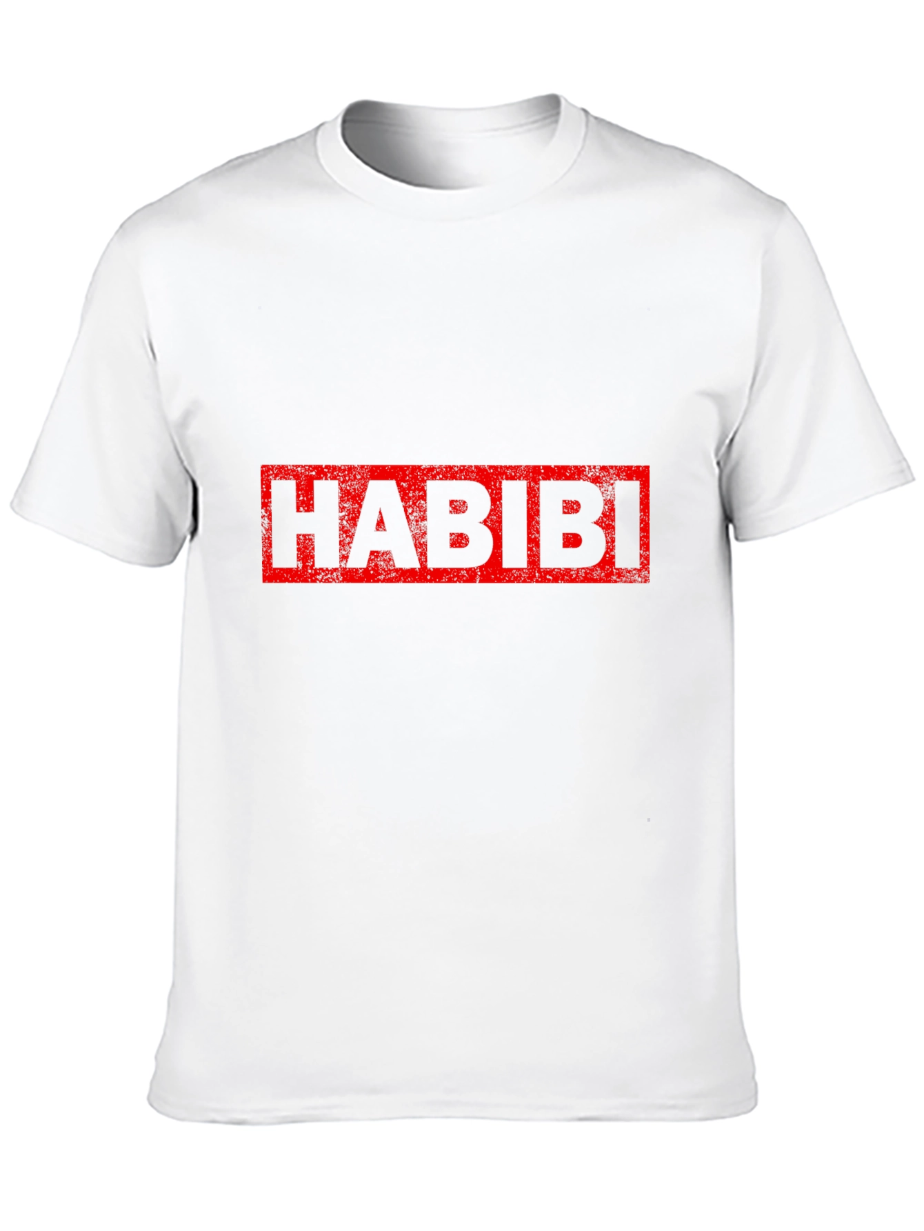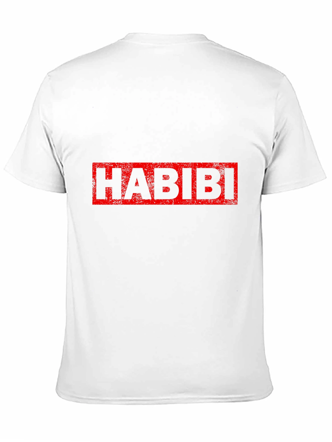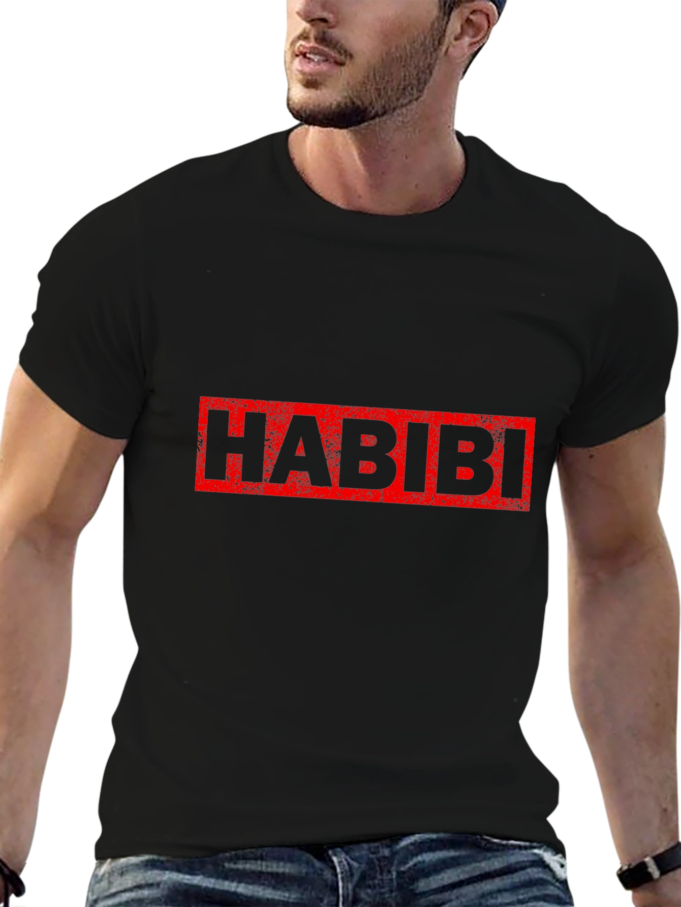 Show off your unique style with this bold black t-shirt featuring the word "Habibi" in a striking red, block-letter design. This tee offers a comfortable fit and a cool, urban edge. Perfect for casual outings, social gatherings, or just relaxing at home, this t-shirt is a great way to express yourself. The short-sleeved design makes it ideal for warmer weather or layering under a jacket. Made from a soft, breathable fabric, this shirt feels as good as it looks. Add a touch of personality to your wardrobe with this trendy and eye-catching piece.