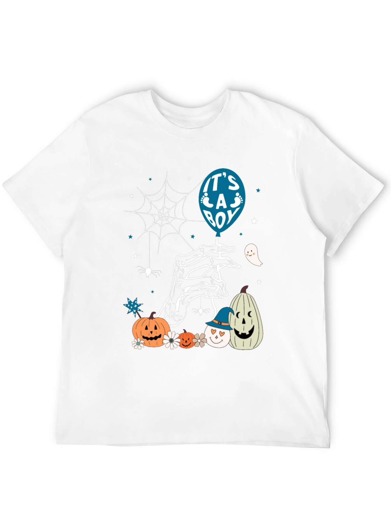 Celebrate your little one's arrival this spooky season with this adorable Halloween-themed baby announcement t-shirt. The black tee features a whimsical design with various pumpkins and flowers, plus a skeleton hand holding a blue 'It's a Boy' balloon. A spiderweb with a dangling spider and cute ghost add a festive touch. Perfect for Halloween parties, baby showers, or everyday wear to share your exciting news! This tee is comfortable and stylish, making it a unique and memorable way to celebrate your baby boy. Great for expecting parents who love Halloween!