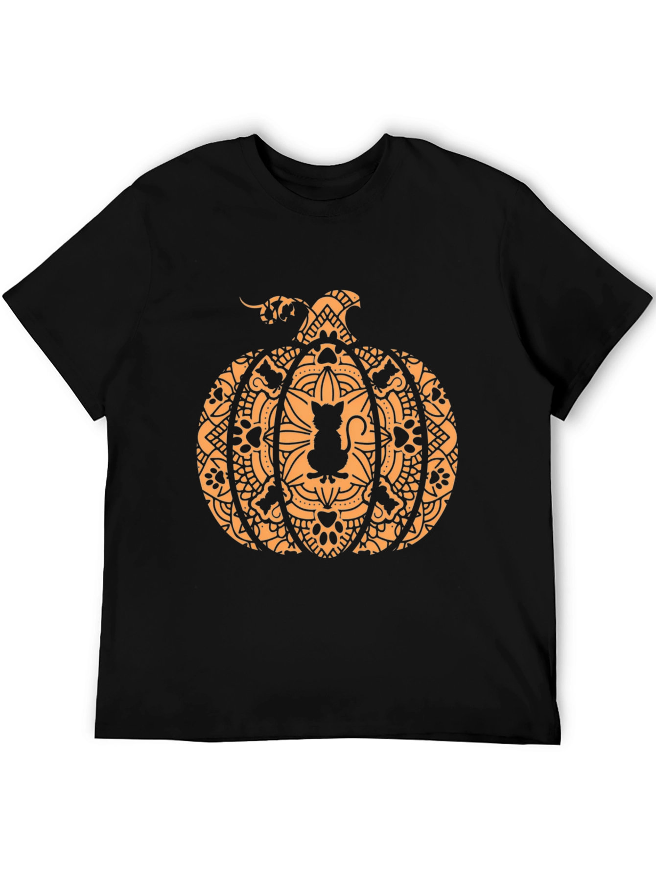 Get into the spooky spirit with this eye-catching Halloween-themed graphic tee! This black t-shirt features a unique and intricate pumpkin design in an orange color. The pumpkin showcases a beautiful mandala pattern with adorable cat paw prints and a silhouetted cat in the center. Perfect for Halloween parties, casual wear during the fall season, or as a gift for cat lovers. Made from a comfortable-looking fabric, this tee is sure to be a stylish and festive addition to your wardrobe. Embrace the fun of Halloween with this must-have graphic tee that combines spooky vibes with feline charm!