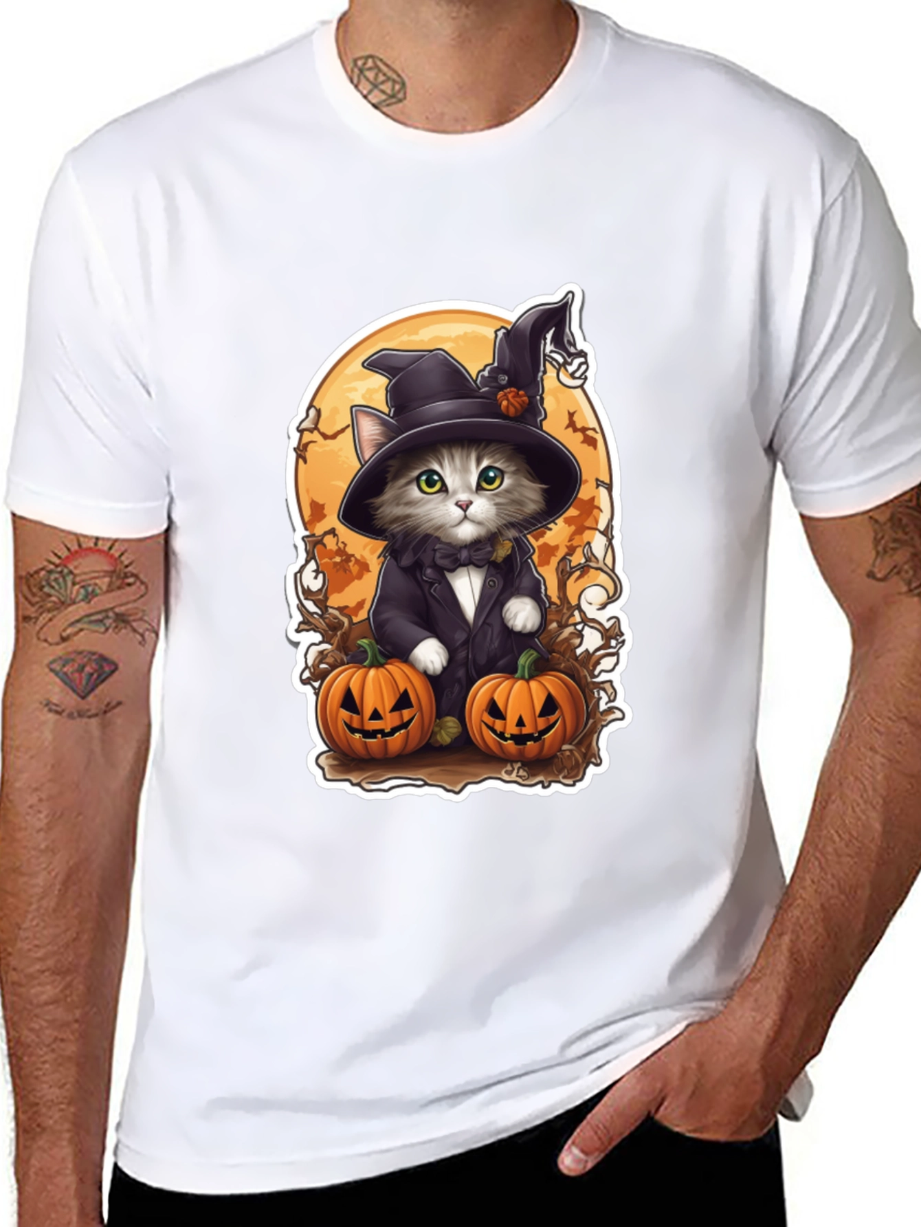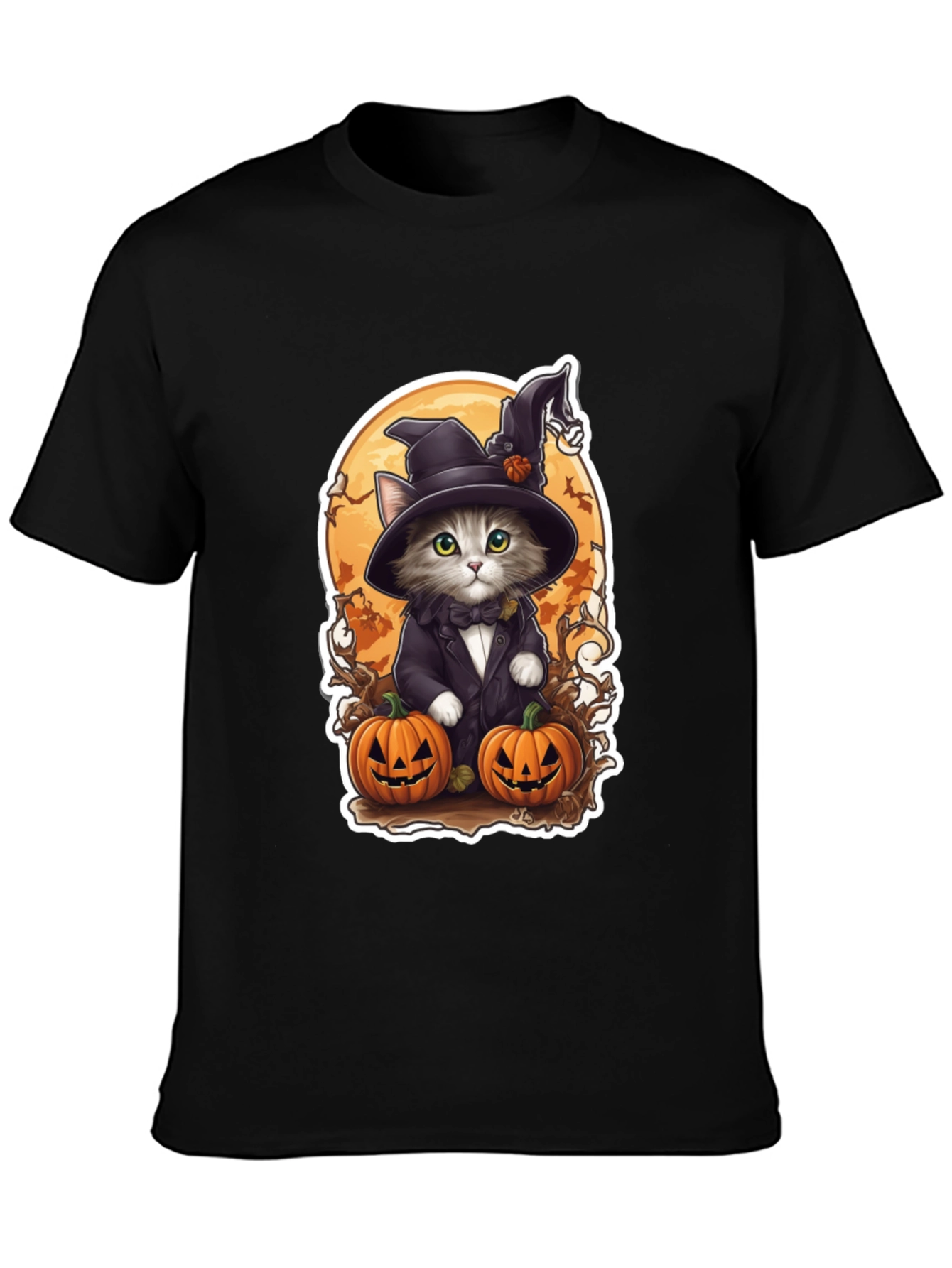 Celebrate Halloween in style with this unique t-shirt! It features a cute cat dressed as a wizard surrounded by Halloween pumpkins in front of a yellow moon. The design is a sticker on a plain black t-shirt. Perfect for Halloween parties, casual wear, or as a gift for cat lovers, this t-shirt combines comfort with spooky style.