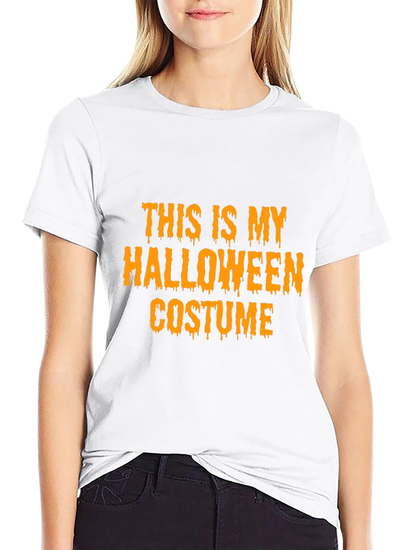 Get ready for Halloween with this funny and easy costume tee! This black t-shirt features bold orange lettering that reads "This Is My Halloween Costume." The relaxed fit and classic crew neck make it comfortable for all-day wear, whether you're trick-or-treating, attending a Halloween party, or just want to show off your holiday spirit. Made from a soft fabric blend, this tee is perfect for a no-fuss, humorous Halloween look. Pair it with jeans or leggings for a complete outfit. Simple, stylish, and fun – this Halloween tee is a must-have!