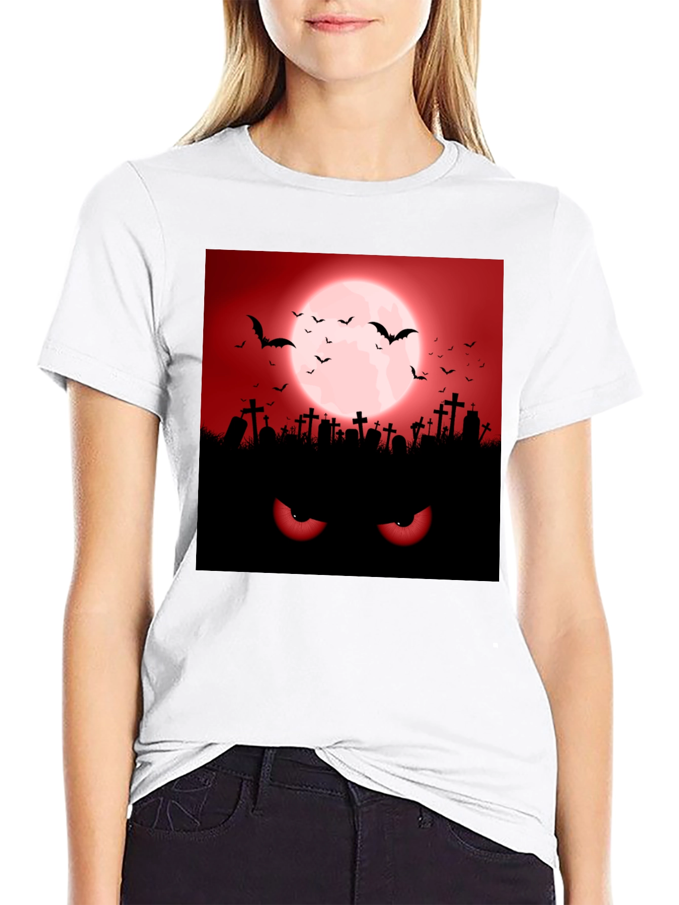 Embrace the spooky season with this unique Halloween-themed T-shirt. Featuring a striking design of a graveyard under a blood-red moon, complete with bats and glowing red eyes lurking in the shadows. This shirt is perfect for Halloween parties, costume events, or just showing off your love for the holiday. Made from comfortable black fabric, it's an excellent addition to your casual wardrobe. Get ready to turn heads and spread some Halloween cheer!