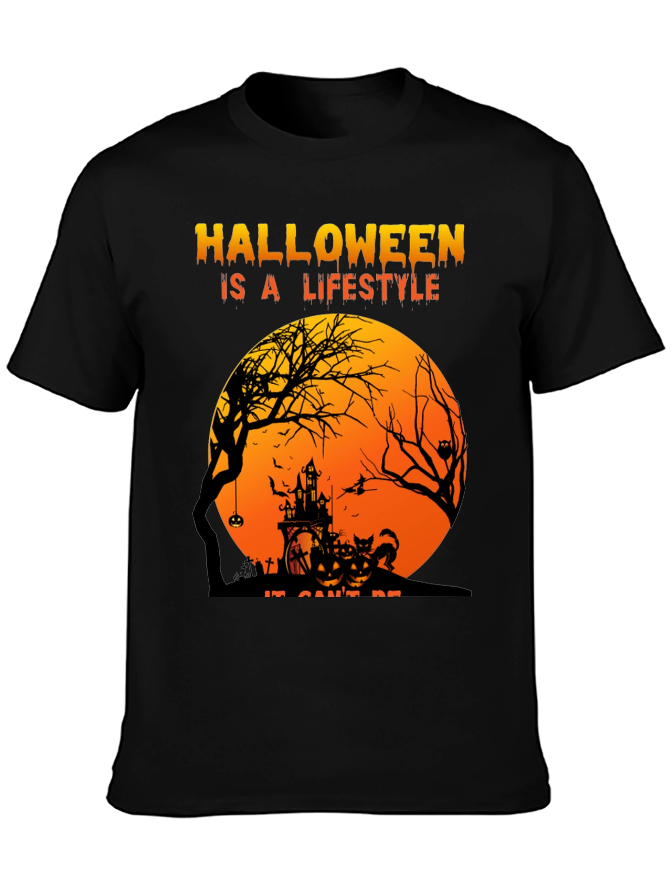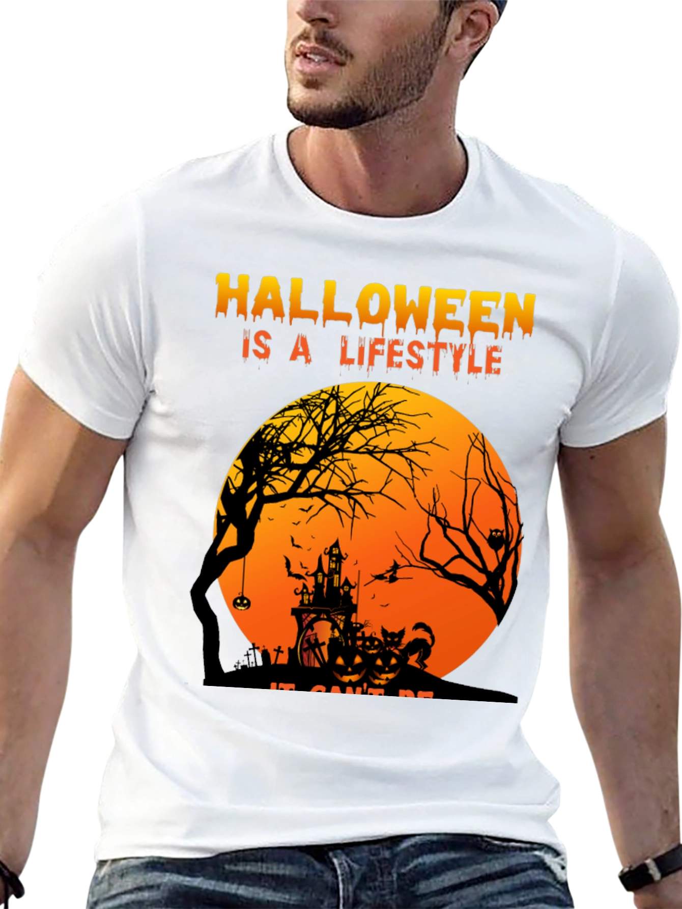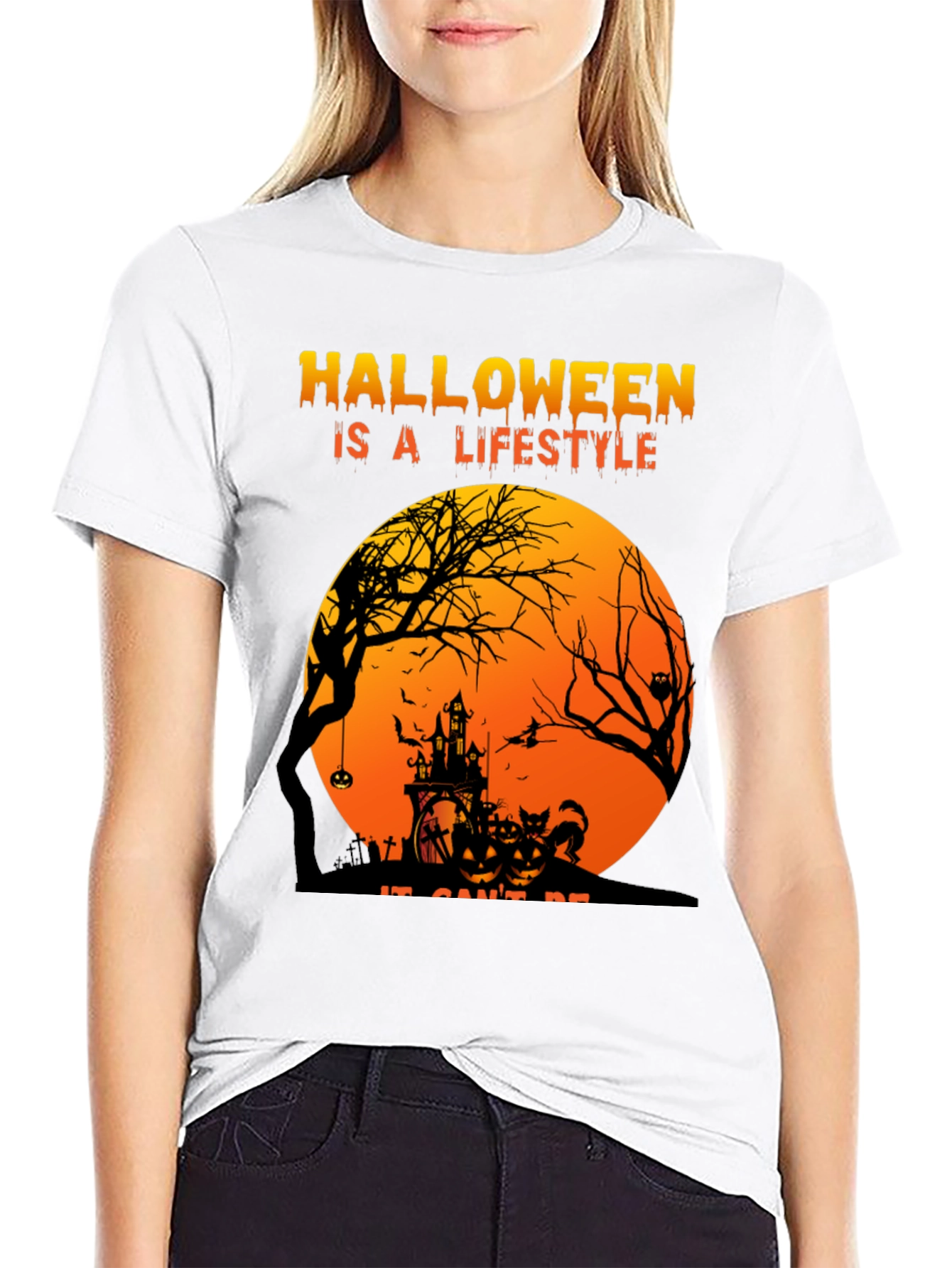 Get ready for spooky season with this unique Halloween-themed T-shirt! The black tee features a bold graphic print of a haunted house, pumpkins, and silhouetted trees set against a striking orange moon. The statement "Halloween is a lifestyle. It can't be" adds a fun, quirky touch. Made from a comfortable material, this short-sleeve shirt is perfect for Halloween parties, trick-or-treating, or everyday wear. Show off your love for Halloween with this eye-catching and spirited T-shirt!