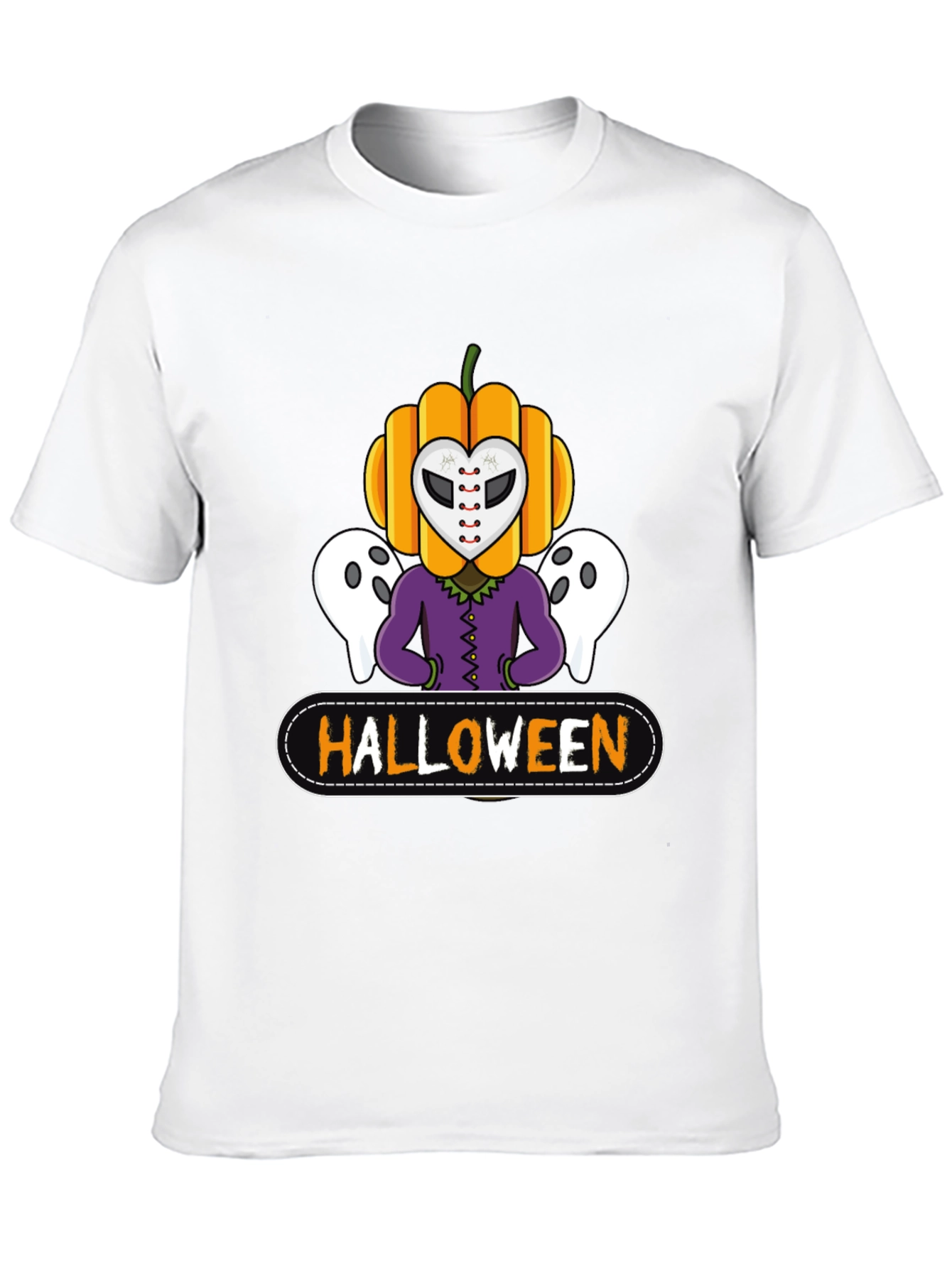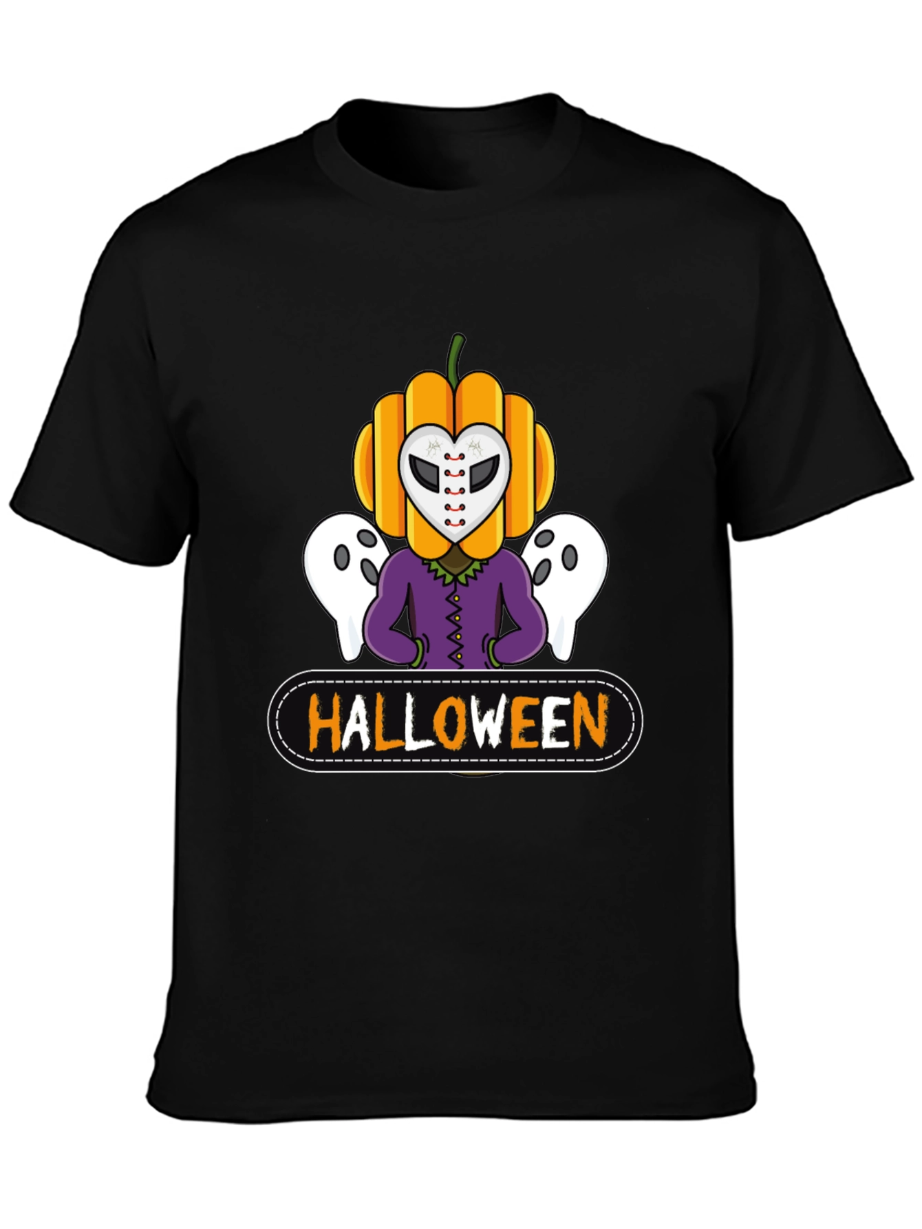 Get ready for spooky season with this Halloween-themed t-shirt! The black tee features a unique graphic design of a pumpkin head character wearing a hockey mask, flanked by two friendly ghosts. The word "HALLOWEEN" is boldly displayed beneath the character in orange lettering. This eye-catching t-shirt is perfect for Halloween parties, trick-or-treating, or just showing off your love for the holiday. Made from soft, breathable fabric, this shirt is comfortable to wear all day and night. A must-have for any Halloween enthusiast's wardrobe.