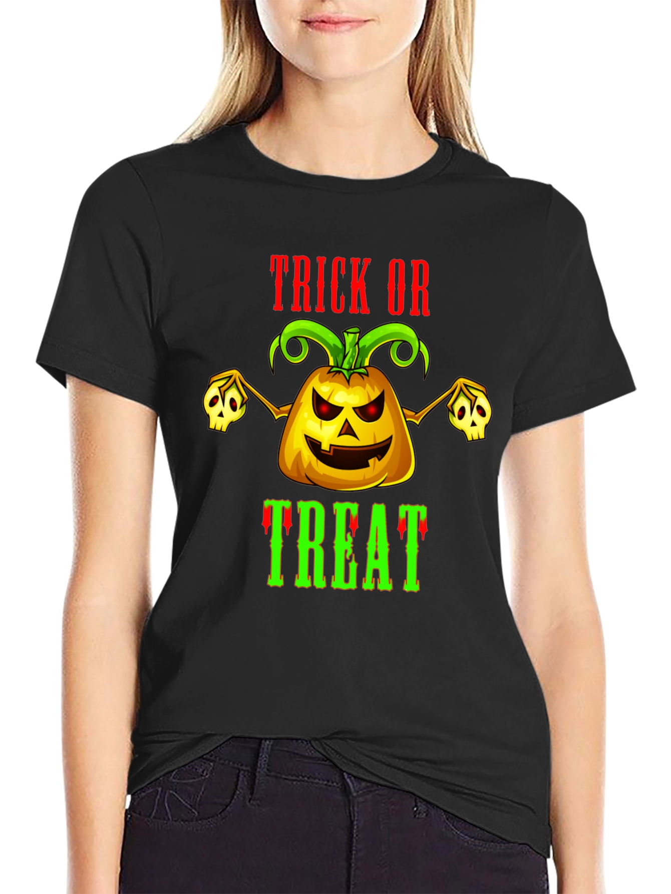 Get spooky this Halloween with this Trick or Treat graphic t-shirt! This unique black tee features a playful yet spooky pumpkin design, complete with skull hands and dripping accents. The words "Trick or Treat" are printed above and below the pumpkin in contrasting colors, adding a fun, seasonal touch. Perfect for Halloween parties, trick-or-treating, or casual wear during the Halloween season, this tee is sure to be a hit. Made from a comfortable material, this tee offers both style and comfort. A must-have for any Halloween enthusiast!