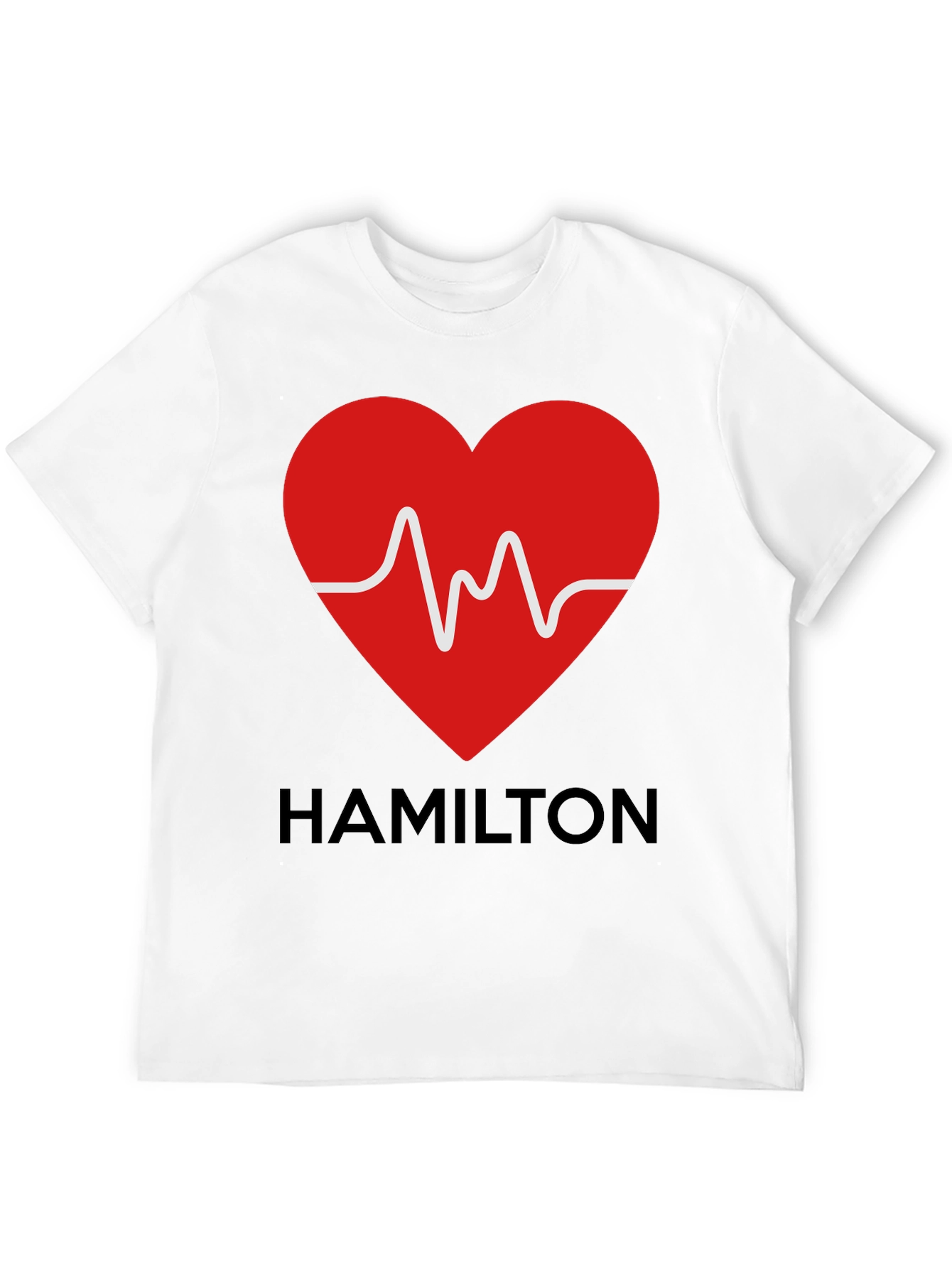 Show your passion for motorsport with this stylish black t-shirt. Featuring a bold red heart graphic intertwined with a white heartbeat line, this tee makes a statement. The word 'Hamilton' is printed below the heart design, adding a personal touch. Made from comfortable, breathable fabric, this shirt is perfect for casual wear, race day events, or as a gift for any motorsport enthusiast. Stand out from the crowd and express your support with this unique and eye-catching t-shirt. Available in various sizes.