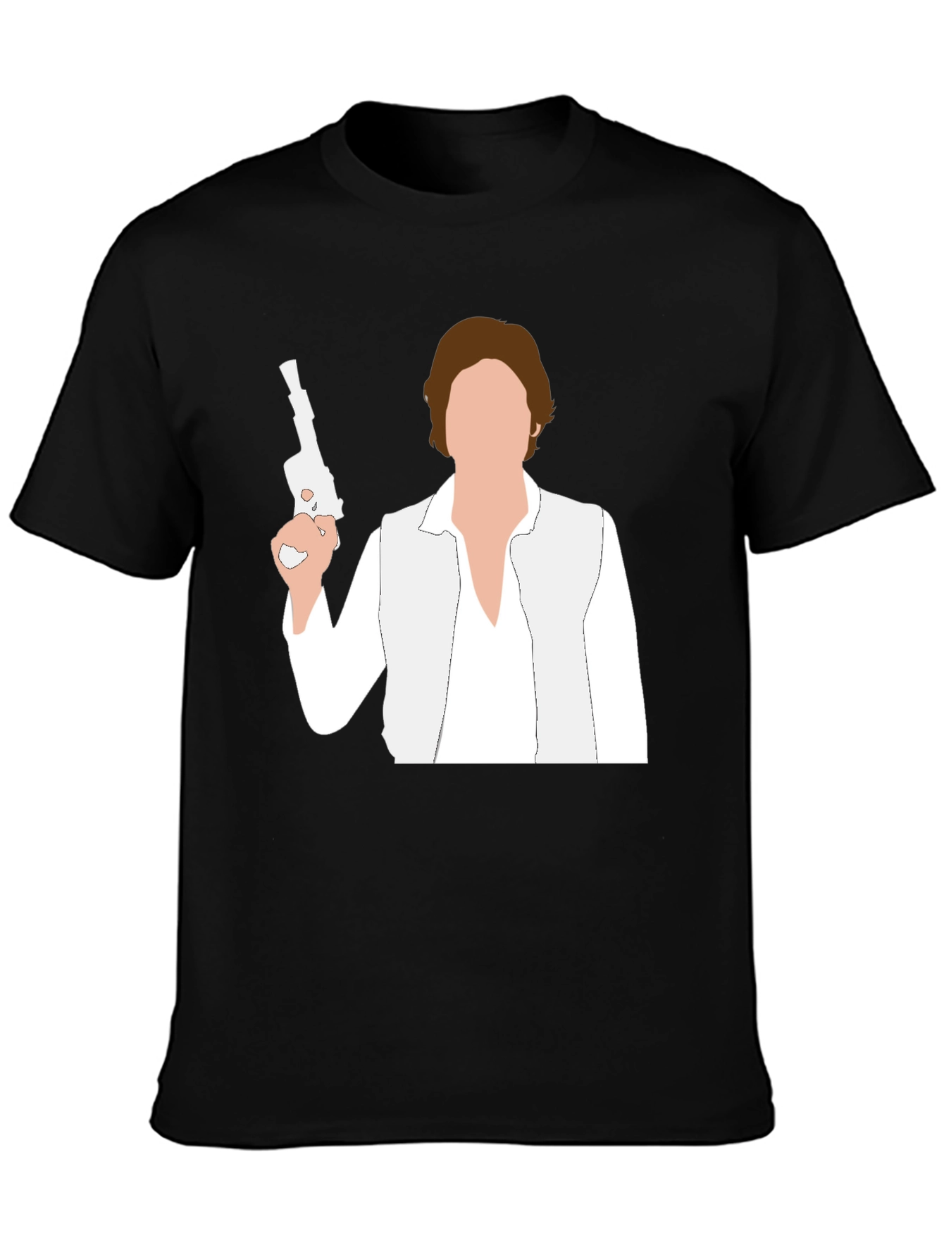 Show off your love for the galaxy far, far away with this eye-catching graphic t-shirt! Featuring a minimalist silhouette design of the iconic Han Solo, complete with his signature blaster, this shirt is perfect for any Star Wars fan. The design is bold and modern, making it a standout piece. Made from a comfortable, soft fabric, this tee is ideal for everyday wear, whether you're heading to a convention, hanging out with friends, or simply relaxing at home. Its classic black color ensures it pairs well with any outfit. Add a touch of intergalactic flair to your wardrobe!