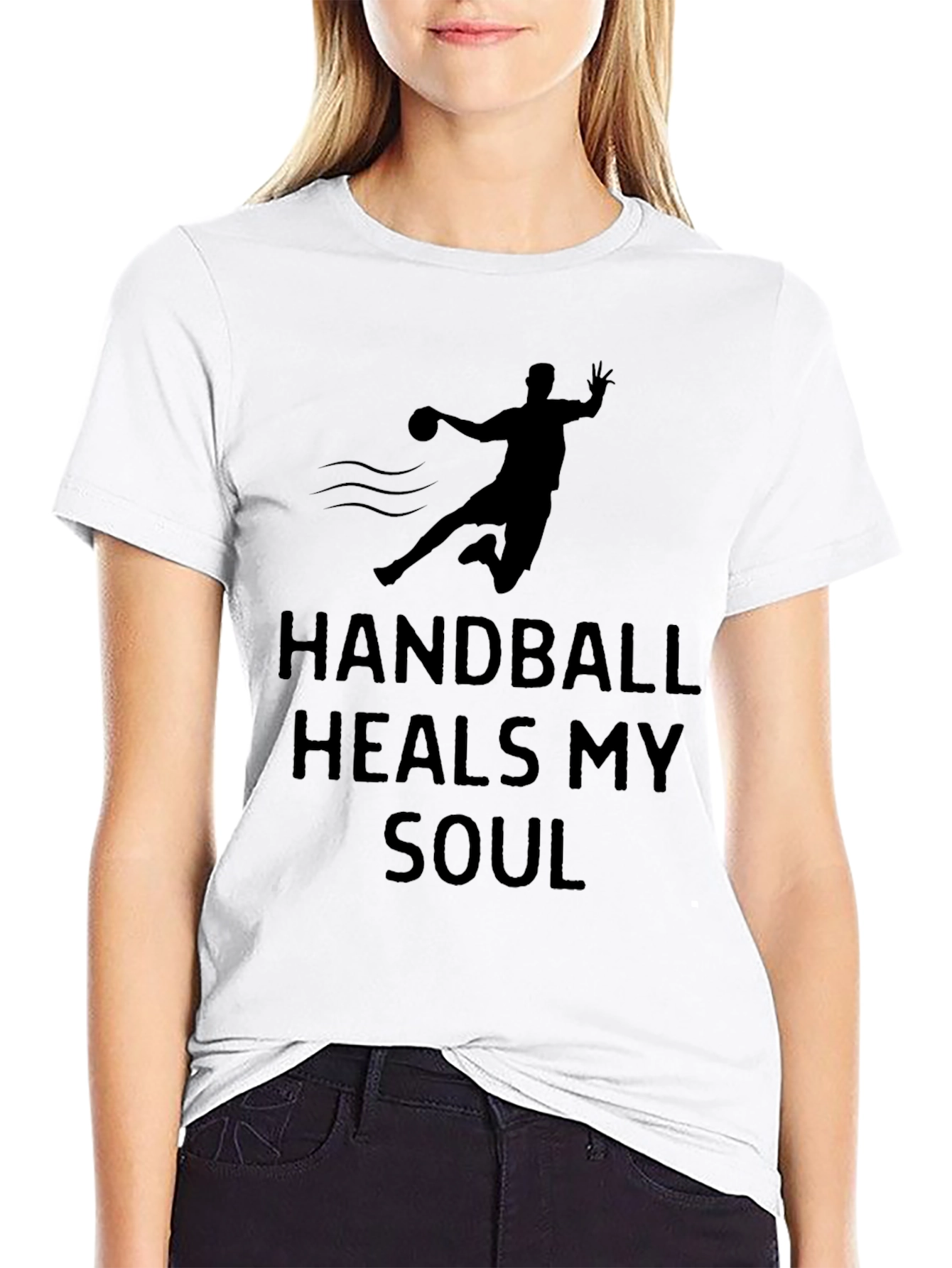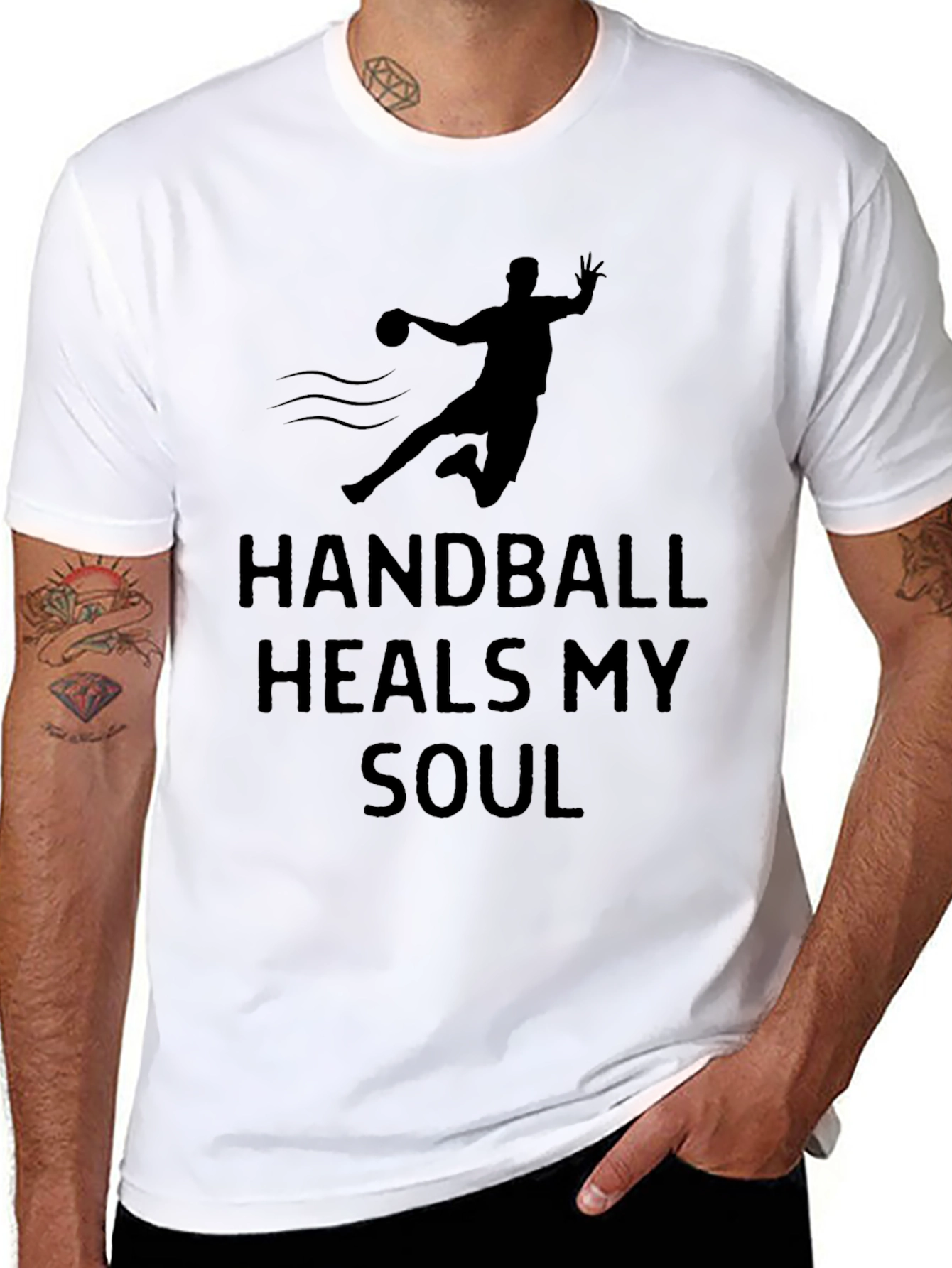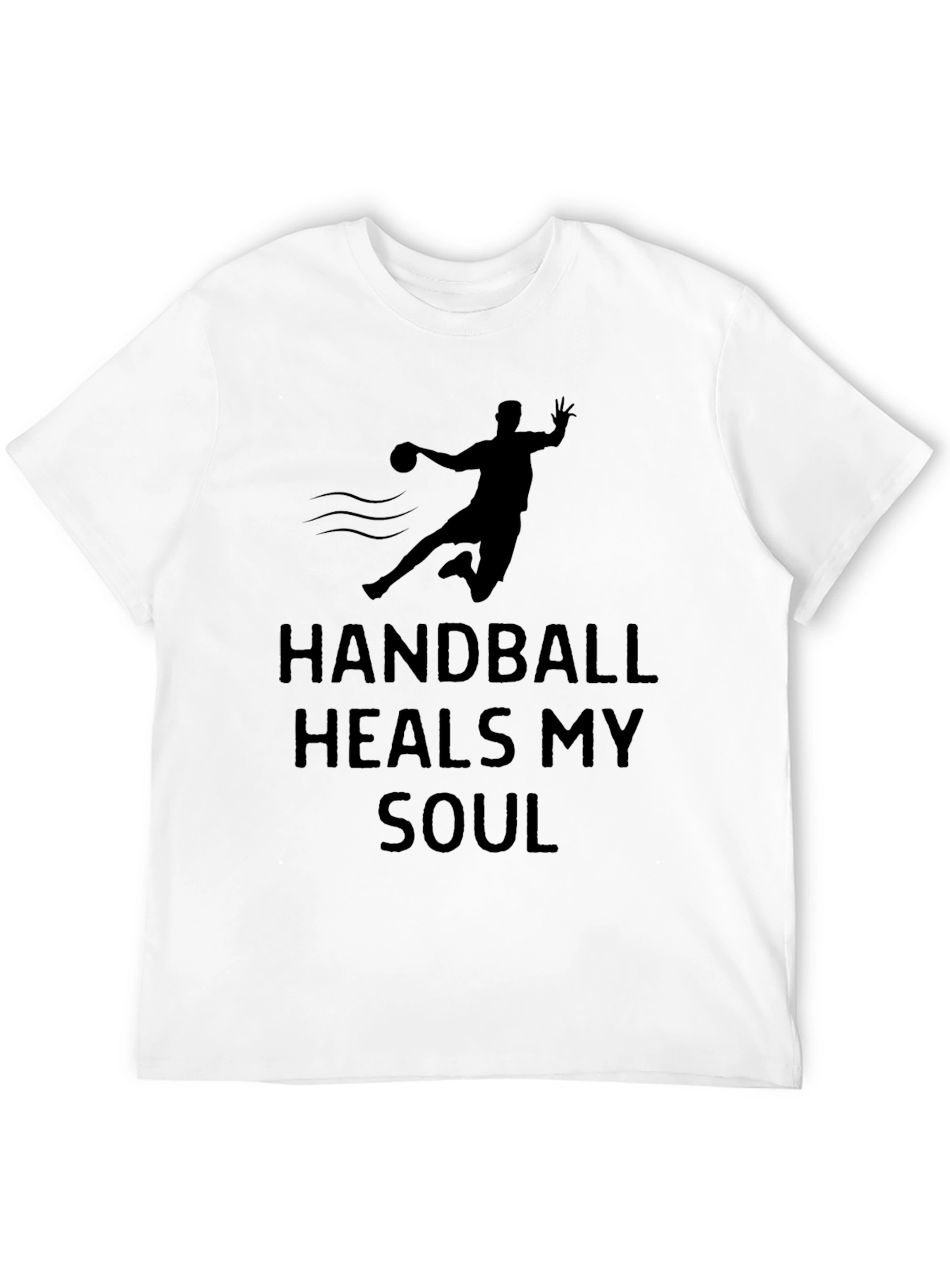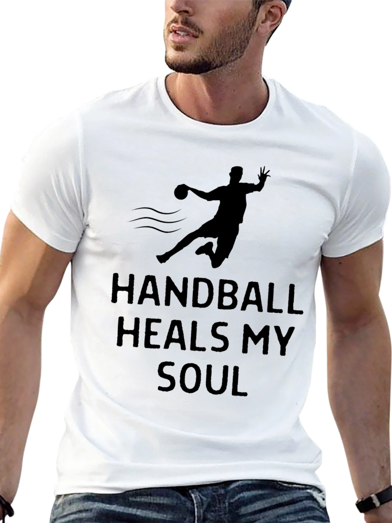Show your love for handball with this unique graphic t-shirt! Featuring a bold design of a handball player in action, paired with the phrase "Handball Heals My Soul," this shirt is perfect for athletes and fans alike. The shirt appears to be made from a soft, comfortable material, perhaps cotton or a cotton blend. The dark color ensures durability and a timeless style. Wear it to your next game, practice, or casual outing to express your passion for handball. A must-have for any handball enthusiast's wardrobe!