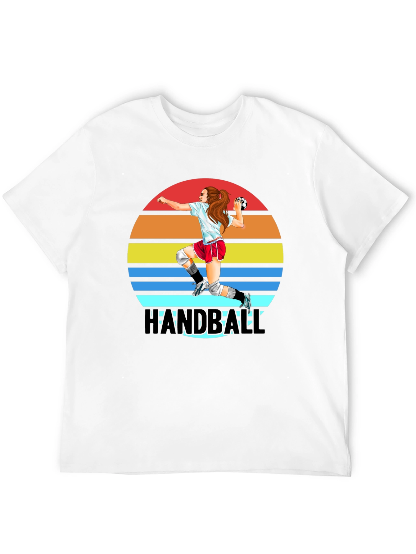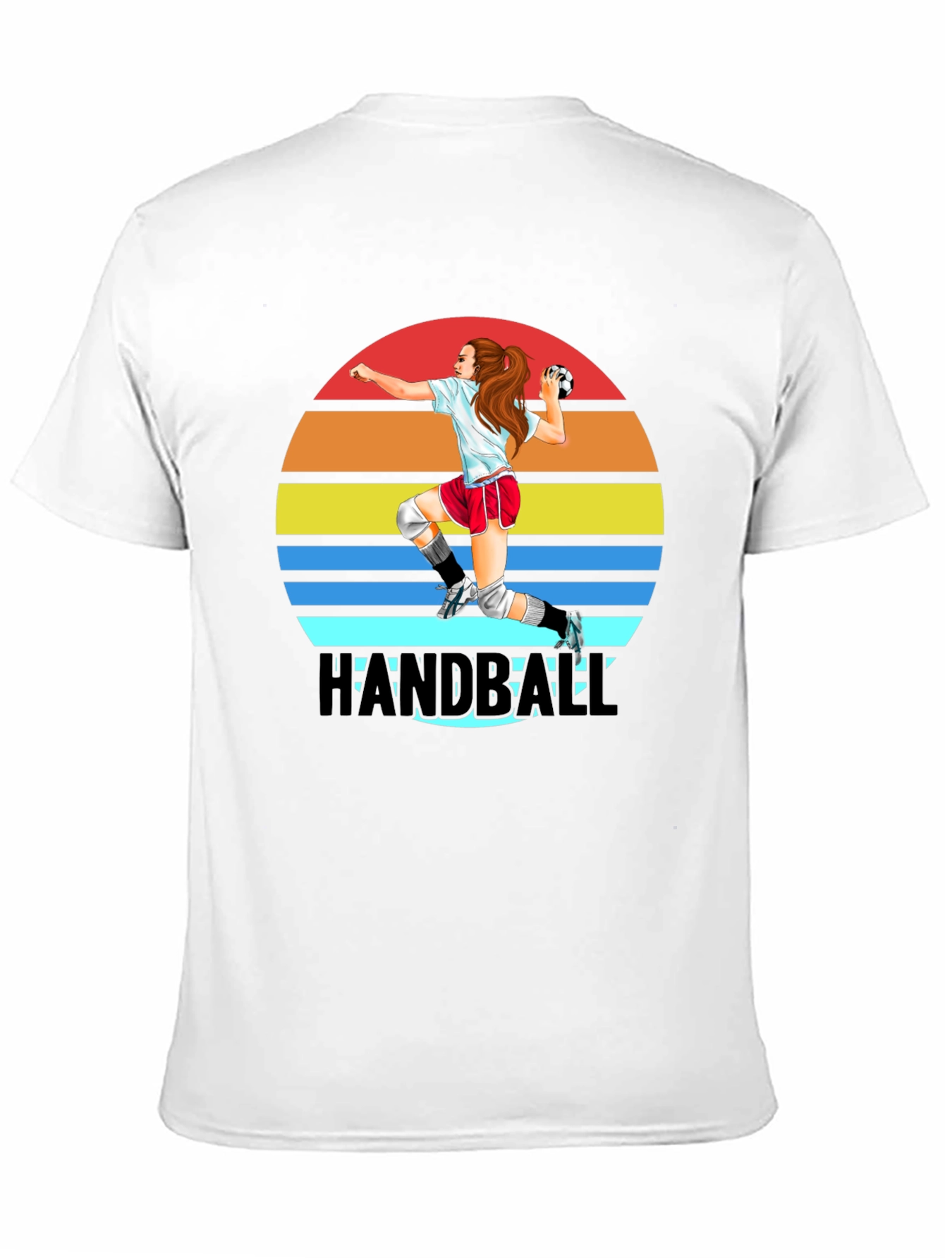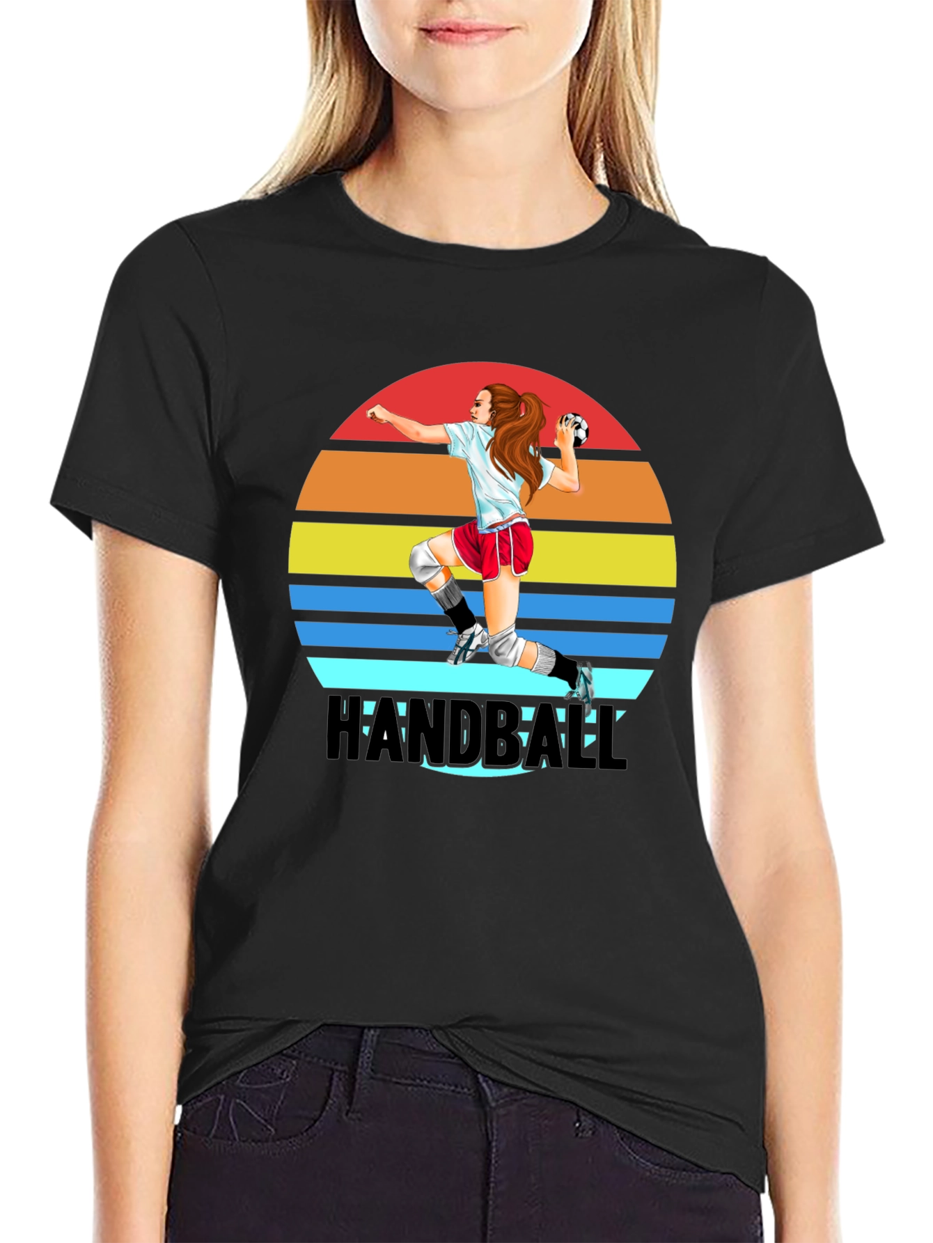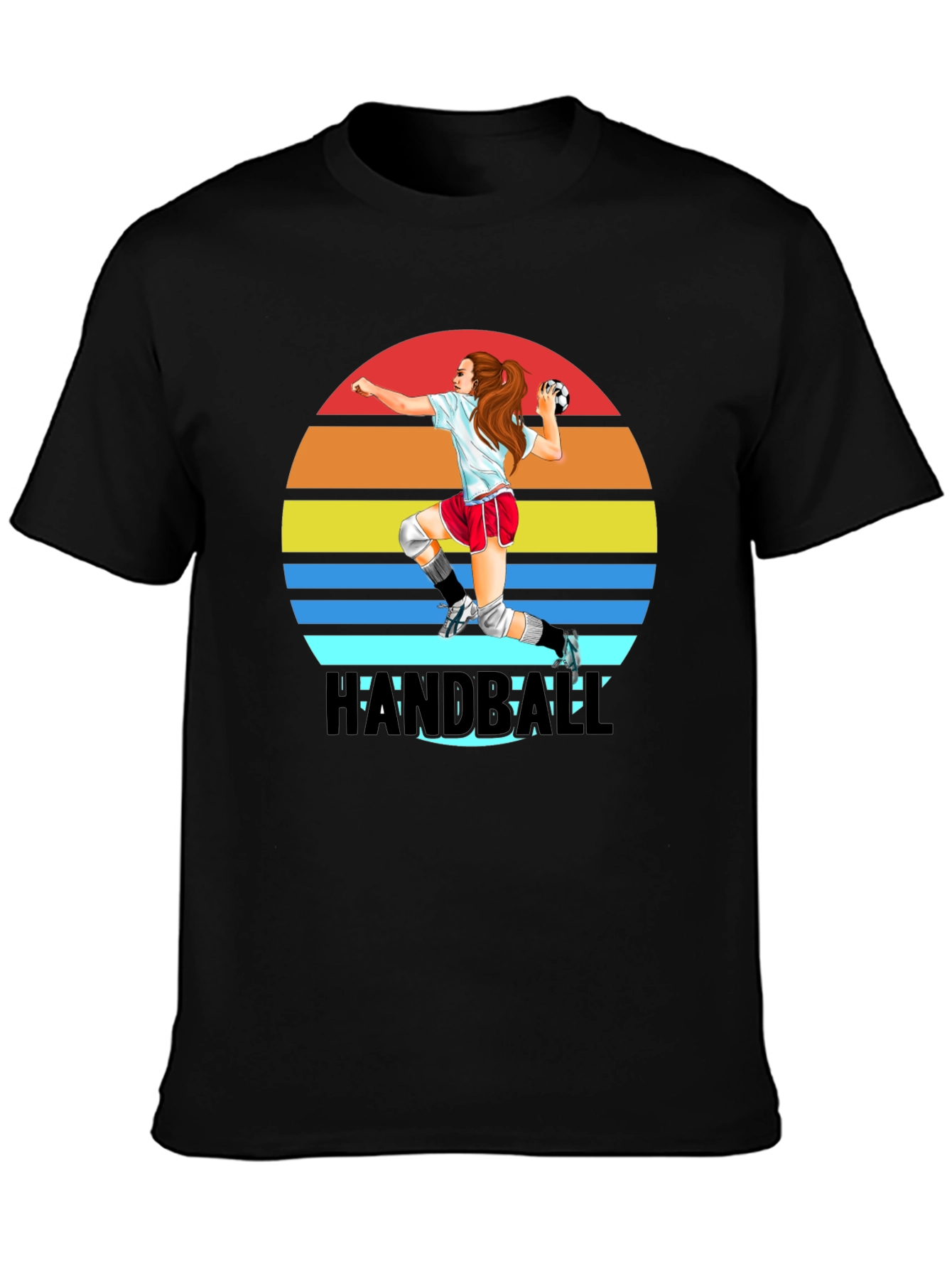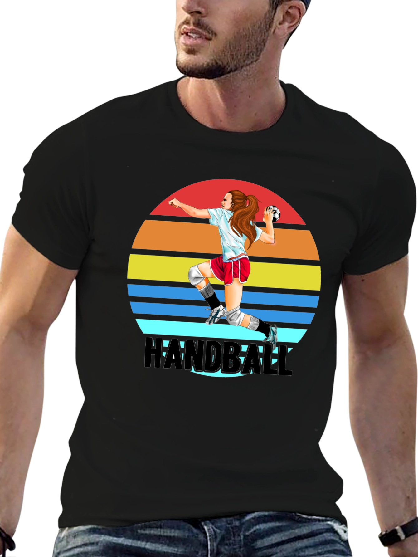 Show off your love for handball with this unique graphic t-shirt. The black tee features a vibrant, retro-style design of a female handball player in action against a striped sunset background. The word 'HANDBALL' is printed below the image. This shirt is perfect for athletes, fans, or anyone who appreciates eye-catching, sporty apparel. Made from comfortable, breathable fabric, it's ideal for everyday wear or as a statement piece at your next game. Get yours today and let everyone know you're a handball enthusiast!