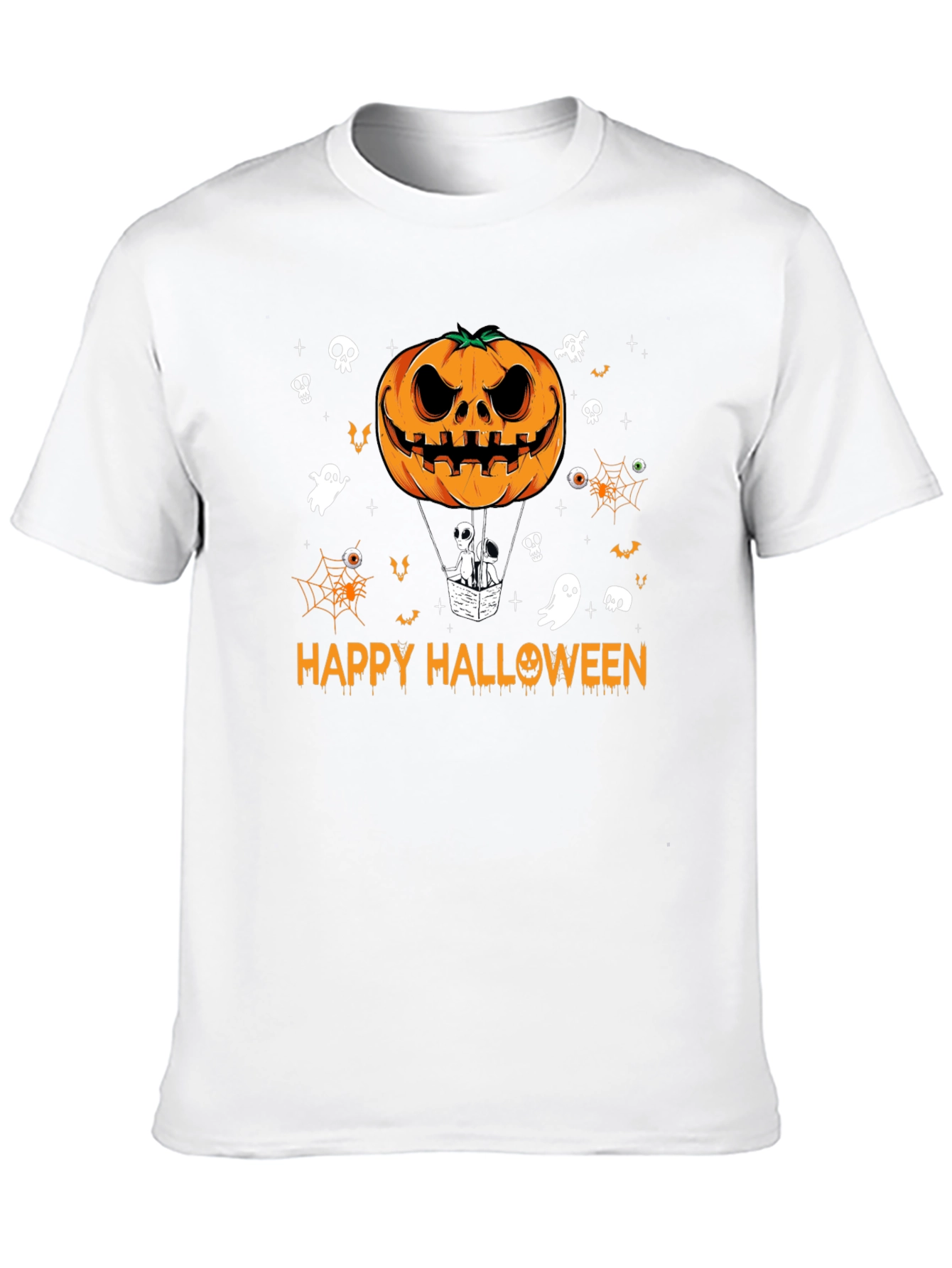 Get ready for spooky season with this fun and festive black t-shirt. Featuring a unique design, the shirt showcases a grinning pumpkin transformed into a hot air balloon. Inside the basket are ghostly figures enjoying the ride! The phrase "HAPPY HALLOWEEN" is emblazoned beneath the balloon in a striking orange hue, perfectly complementing the pumpkin's color. Made from a comfortable, breathable fabric, this tee is perfect for Halloween parties, trick-or-treating, or simply showing off your Halloween spirit. Add a touch of playful fright to your wardrobe with this eye-catching Halloween t-shirt!