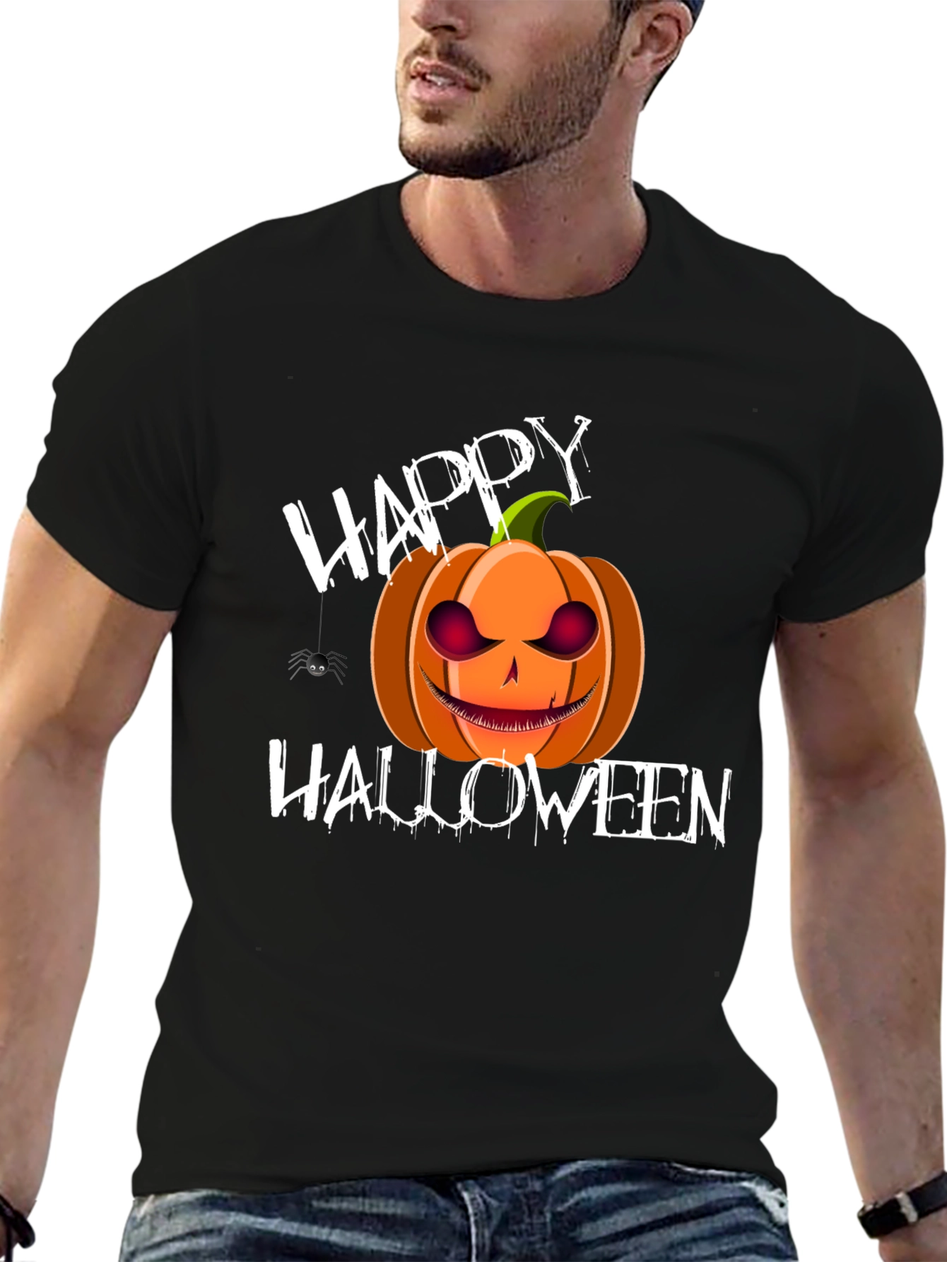 Get ready for Halloween with this spooky t-shirt! The shirt features a graphic of a grinning Jack-O-Lantern with piercing red eyes, accompanied by the words "Happy Halloween" in a dripping, gothic font. A small spider hangs off the side of the pumpkin adding a touch of fright. This tee is perfect for Halloween parties, trick-or-treating, or just showing off your love for the holiday. The comfortable, black fabric and classic fit make it a versatile addition to your wardrobe. Show off your festive spirit with this eye-catching and comfortable tee.