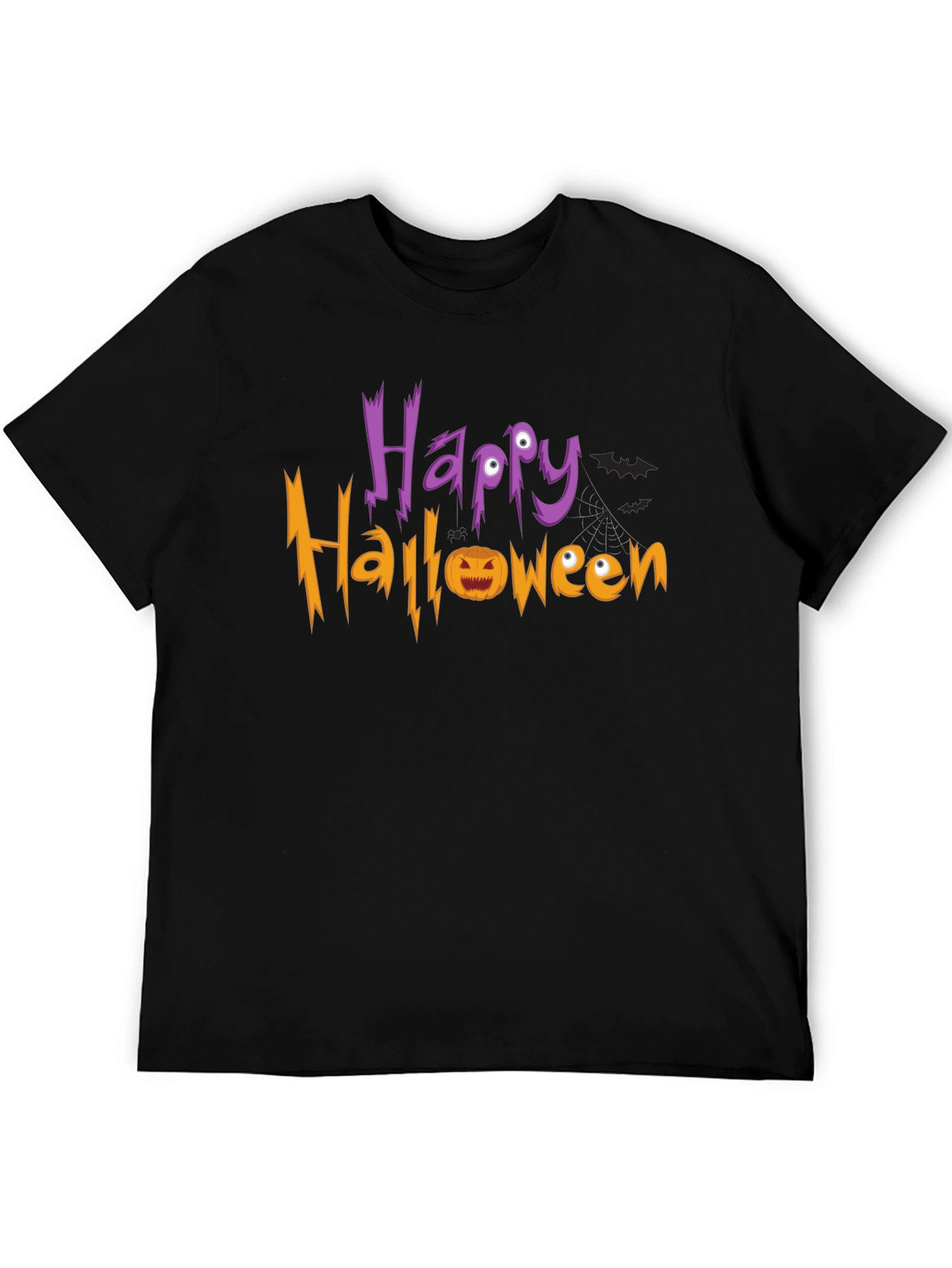 Get ready for spooky season with this fun and festive "Happy Halloween" T-shirt! The black tee features a vibrant graphic design with the word 'Happy' in purple and 'Halloween' in orange. The 'o' in Halloween is playfully designed as a smiling pumpkin, and a web with bats complete the Halloween theme. Made from soft, breathable fabric, this shirt is comfortable to wear all day long, whether you're trick-or-treating with the kids, attending a Halloween party, or just showing off your Halloween spirit. A perfect addition to your Halloween wardrobe!