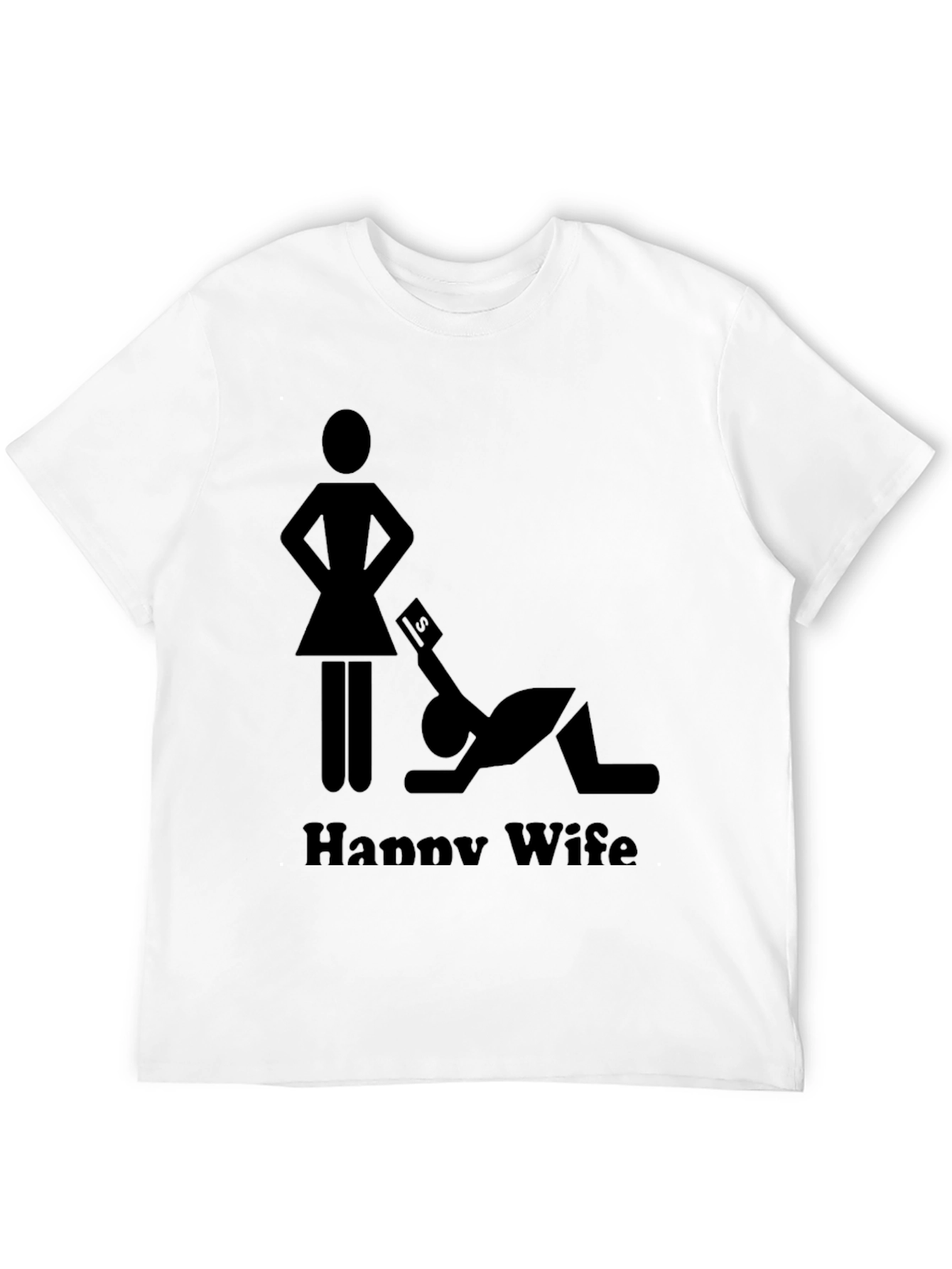This black T-shirt features a humorous graphic design. The design shows a stylized image of a man kneeling and giving a credit card to a woman, with the words 'Happy Wife'. This shirt is perfect for adding a touch of humor to your wardrobe. It is made from comfortable, breathable fabric. Ideal for casual outings, social gatherings, or lounging at home, this T-shirt will become a conversation starter. A great gift for husbands with a sense of humor!