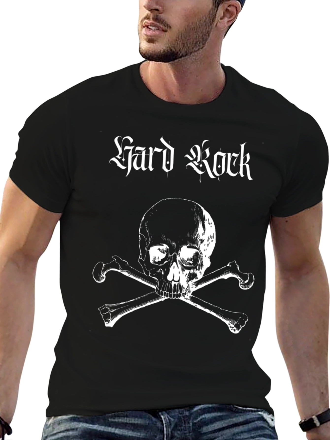 Rock your style with this edgy black t-shirt featuring a bold white "Hard Rock" gothic text and a striking skull and crossbones graphic. The design is prominently displayed on the front, making a statement. Made from comfortable, breathable fabric, this shirt is perfect for casual wear, concerts, or expressing your unique style. Pair it with jeans or shorts for a classic rock-inspired look. A must-have for any hard rock enthusiast looking to add some rebellious flair to their wardrobe!