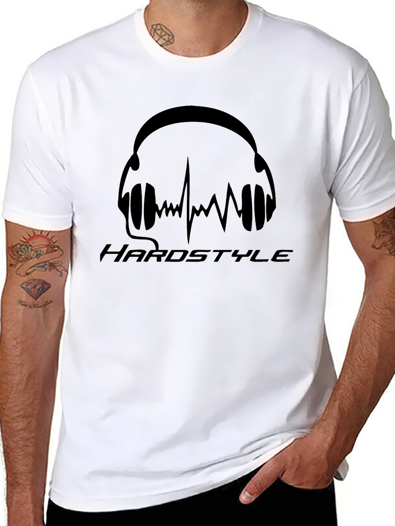 Rock your style with this sleek black t-shirt featuring a bold 'Hardstyle' graphic. The design incorporates a stylized headphone illustration with sound wave elements, creating a visually striking look for music lovers and DJs. Made from a comfortable, breathable fabric, this tee is perfect for casual wear, concerts, or hitting the club. The classic crew neck and short sleeves offer a relaxed fit that pairs effortlessly with jeans, shorts, or joggers. Express your passion for music and make a statement with this unique and eye-catching t-shirt. Perfect for music festivals, parties, or everyday style.